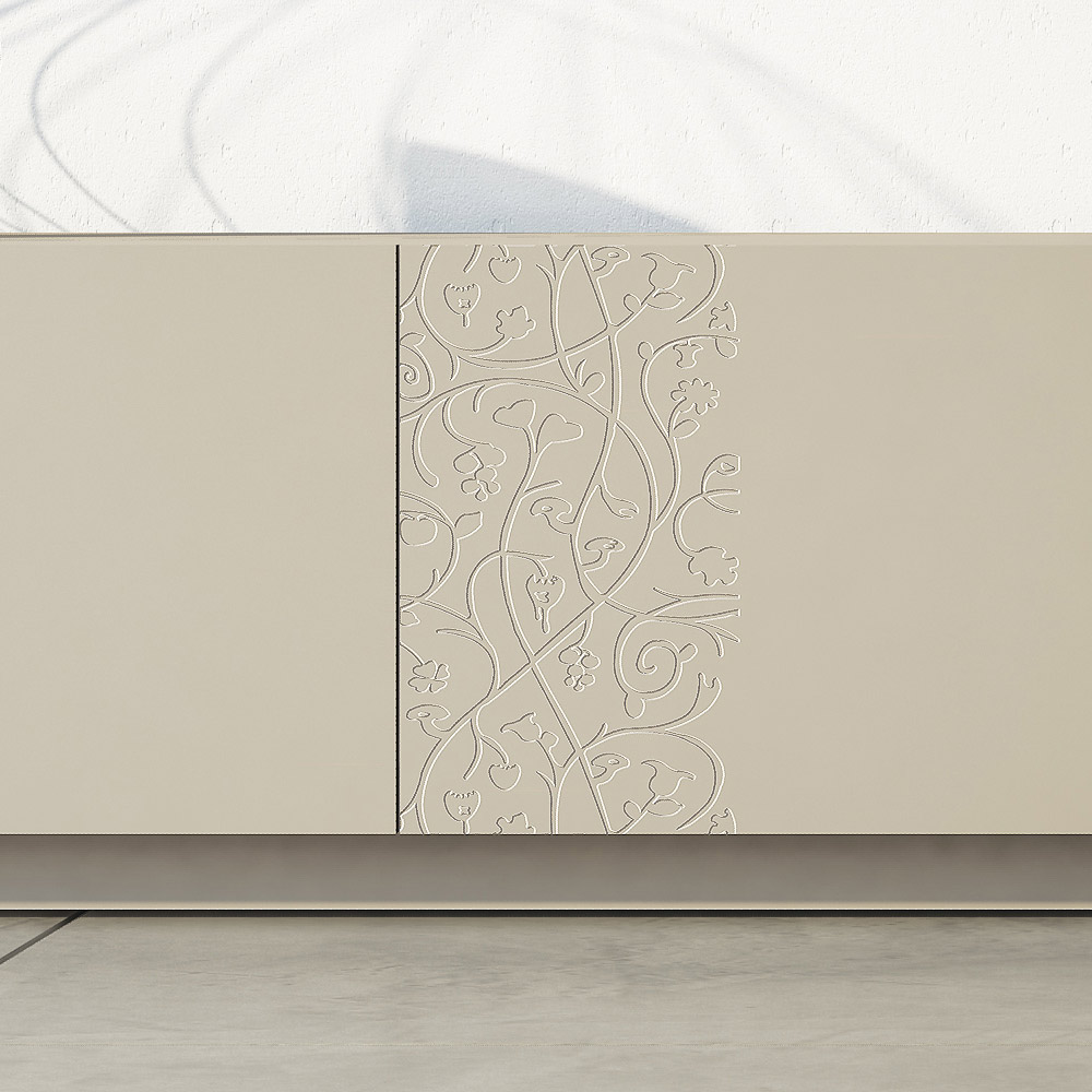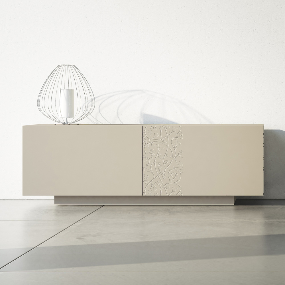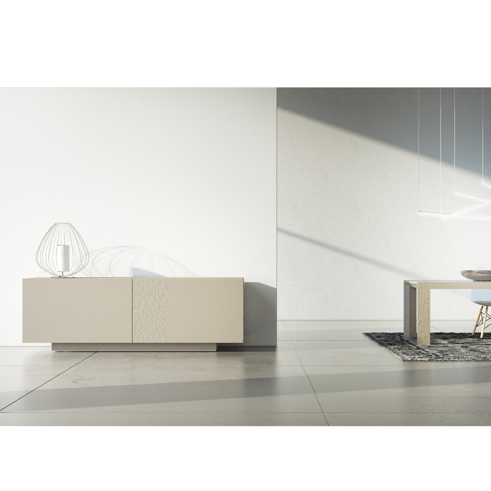 Příborník do obývacího pokoje s alpakovou šedou matně lakovanou MDF konstrukcí složenou ze 2 koplanárních posuvných dveří které zaručují skvělou funkčnost a praktičnost az lakovaného soklu , který nabízí velkou stabilitu. Tento produkt je plný vkusu a designu díky svým elegantním a rafinovaným povrchovým úpravám a částečnému basreliéfnímu zdobení dveří, které jej činí jedinečným svého druhu. Různé materiály použité na konstrukci nabízejí vysokou kvalitu a odolnost v průběhu času, což produktu dodává jedinečný a nezapomenutelný nádech.