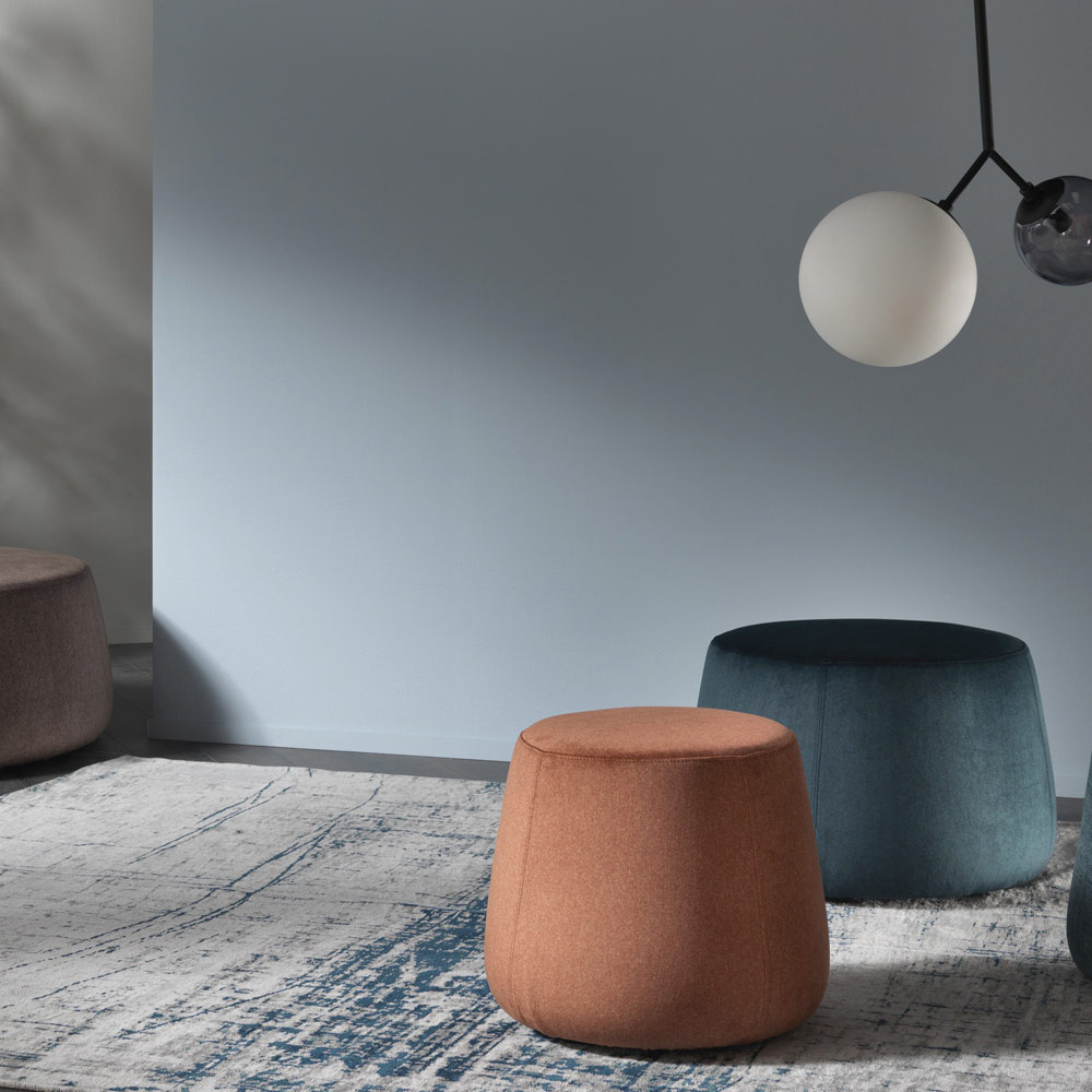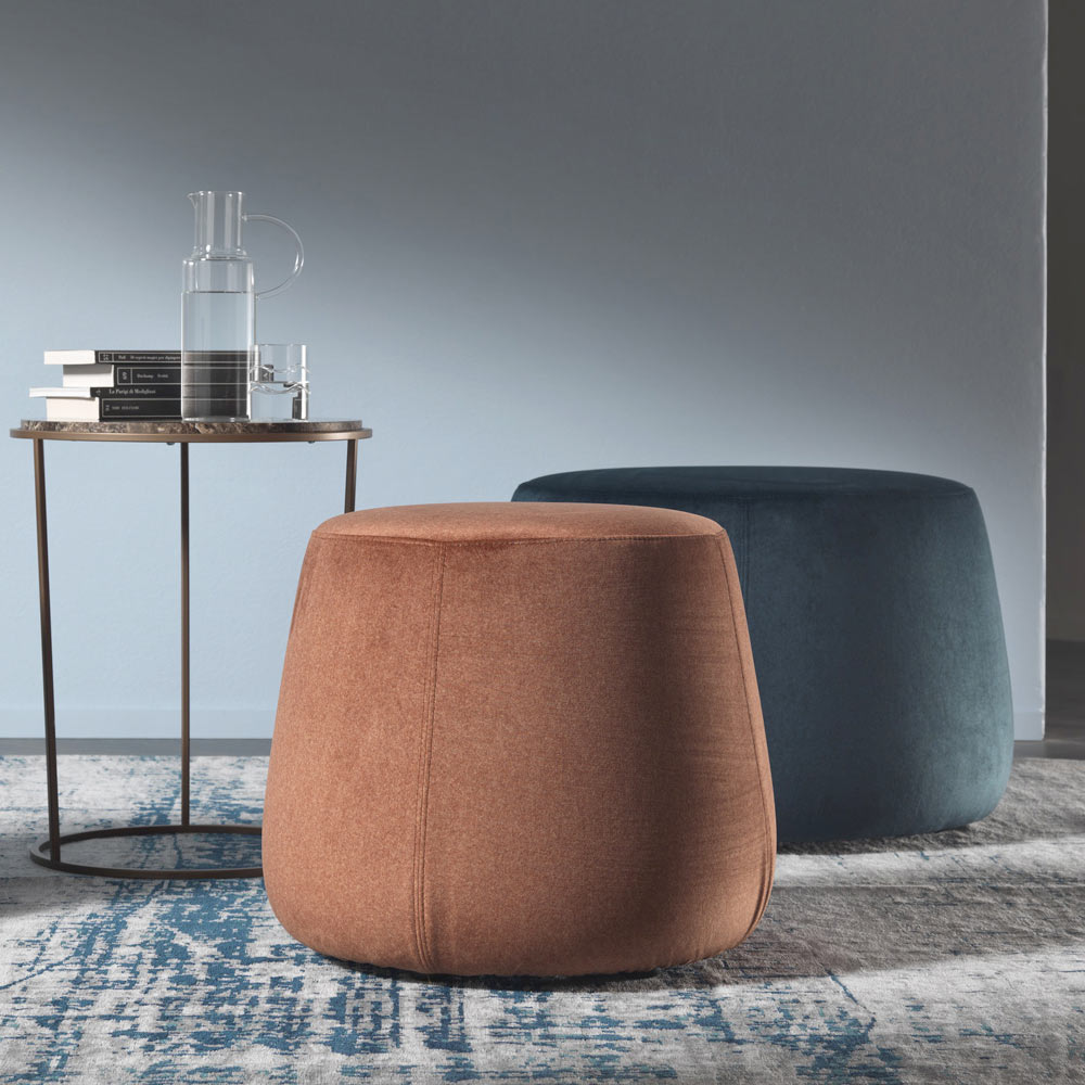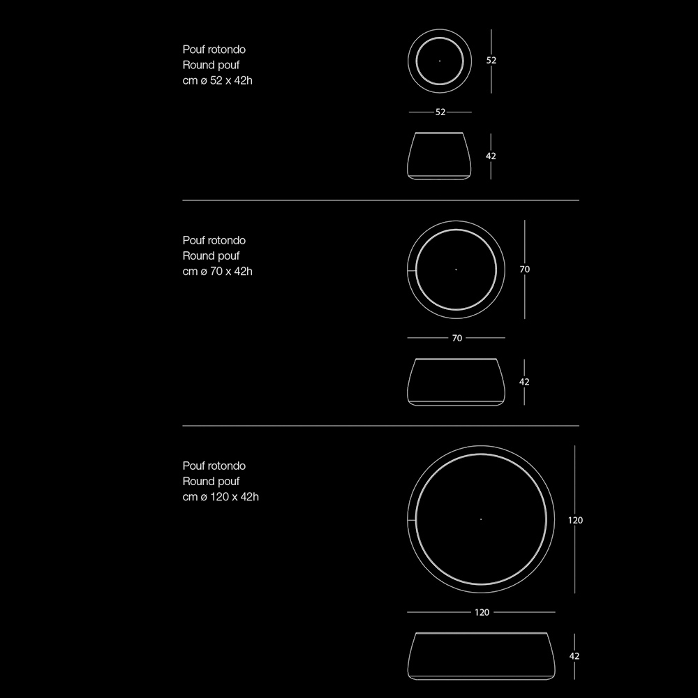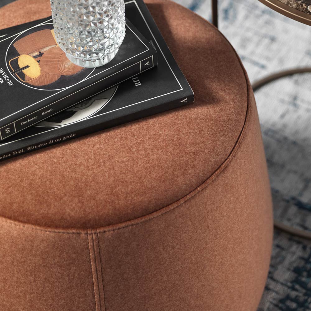 Moderní a kulatý designový puf dostupný ve třech různých šířkách je zcela pokryt měkkým odnímatelným sametem, který je k dispozici v 6 povrchových úpravách.