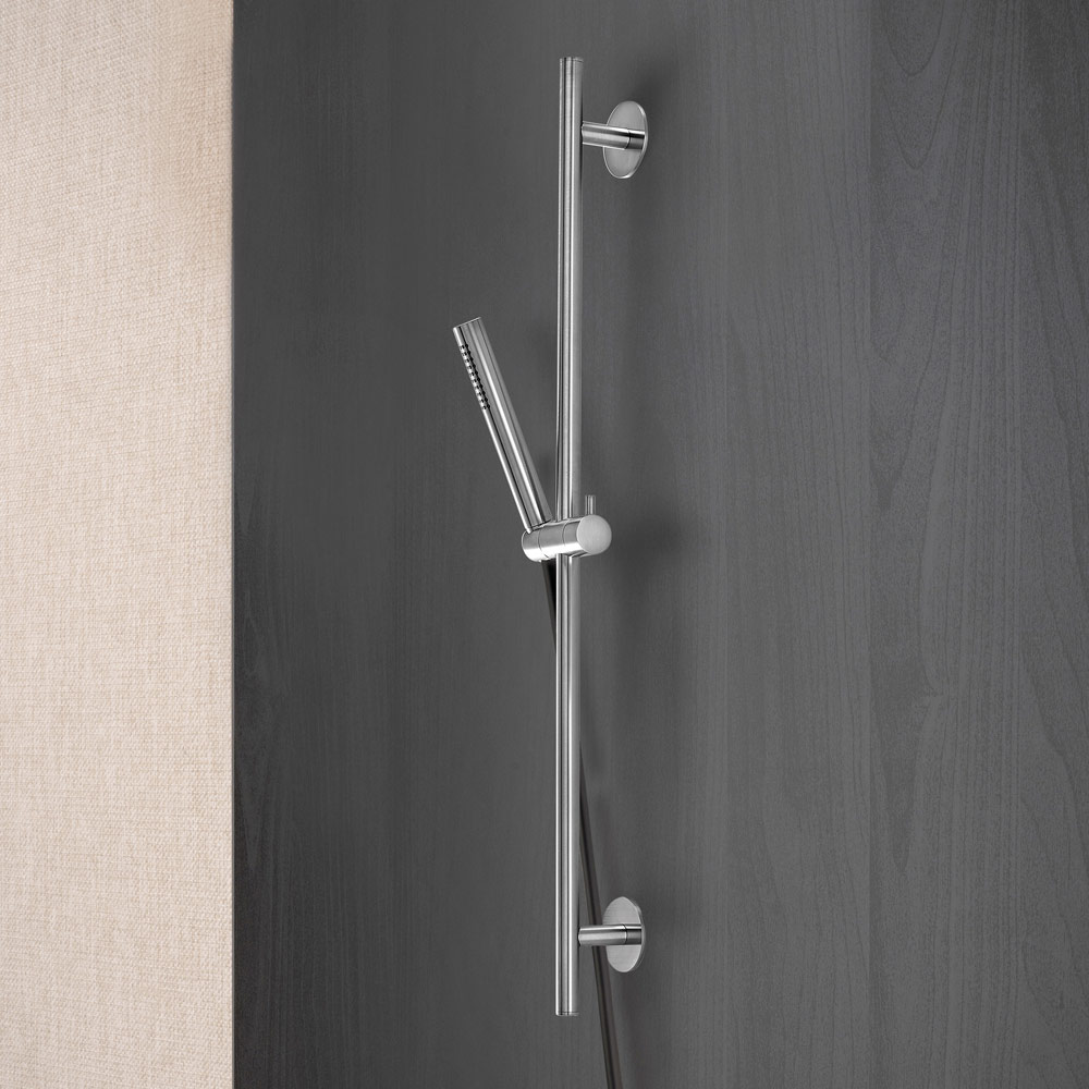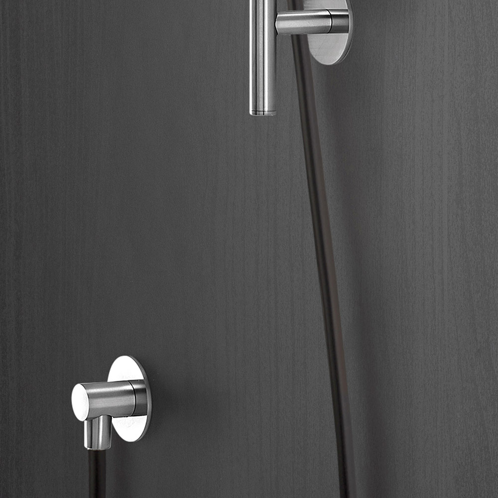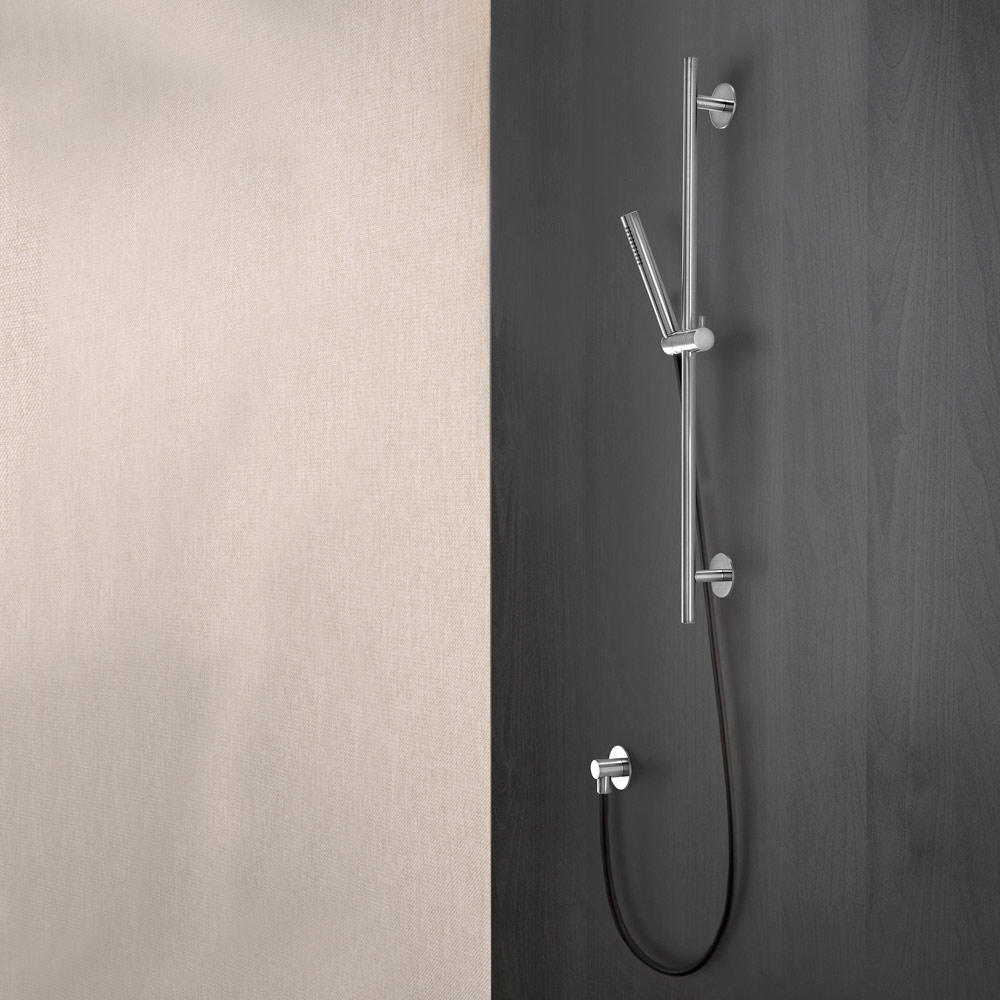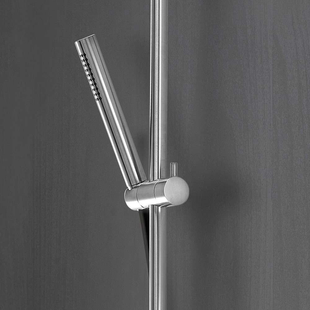 Ocelová sprchová tyč skládající se z: rampy s ocelovou tyčí kruhového průřezu, kruhové ocelové sprchové hlavice proti vodnímu kameni, ohebné hadice darkflex proti kroucení Made in Italy