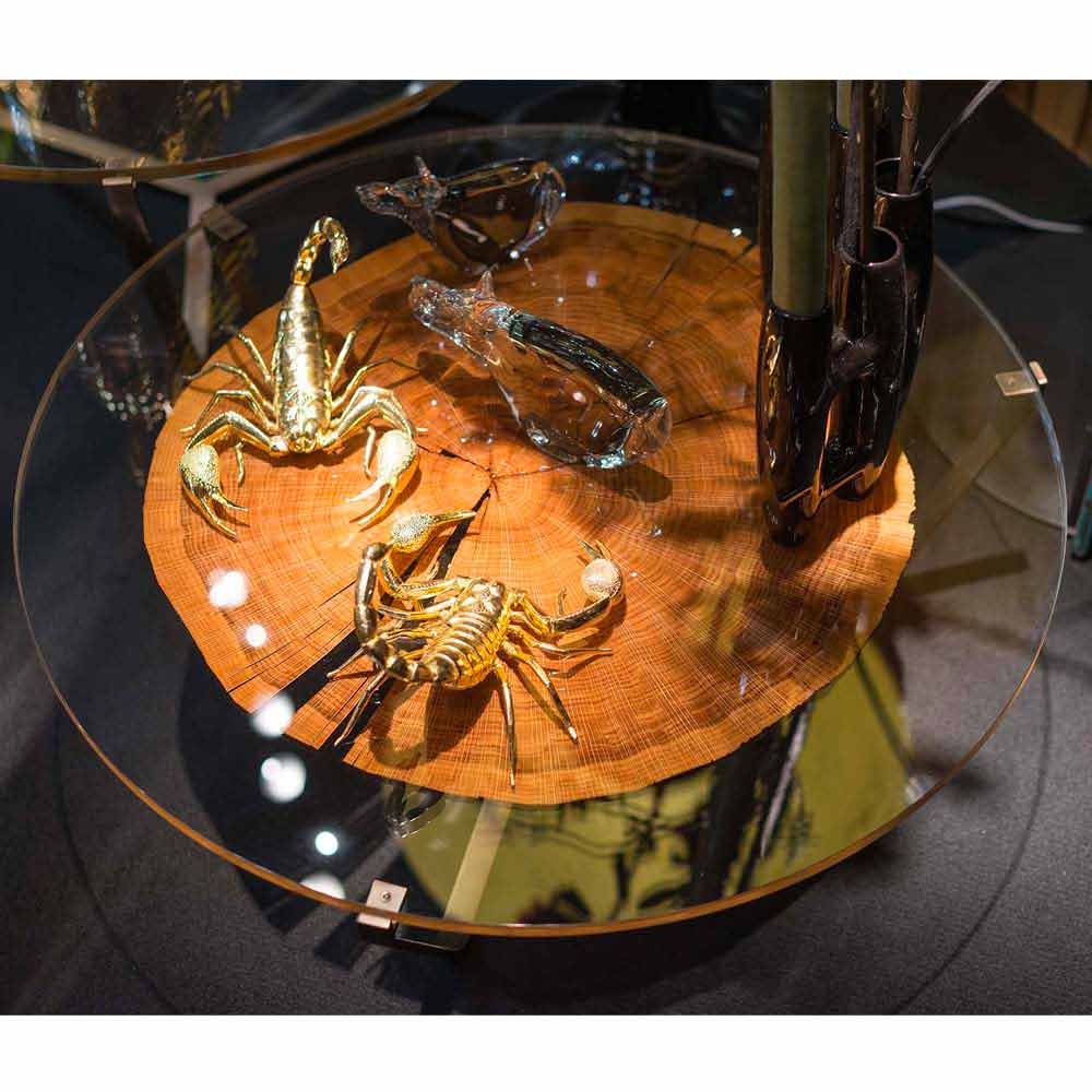 Podlaha se skládá ze dvou spojených vrstev skla 5 + 5 cm, které obsahují část dřevěné dýhy hlavy, podporovaný nohy v kartáčované mosazi.