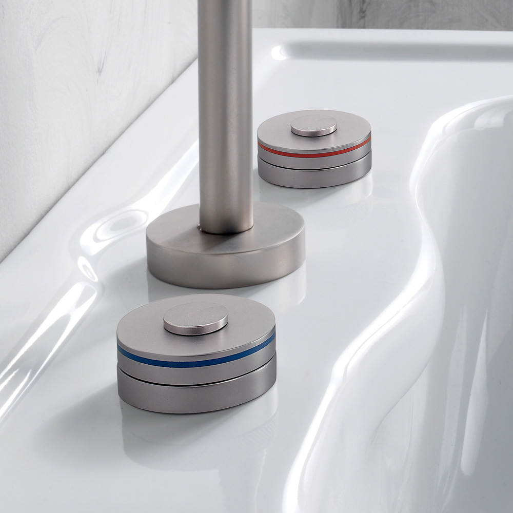 Baterie 3-otvorová umyvadlová baterie s odtokem kompletně vyrobená ručně odbornými řemeslníky v oboru ztěžké mosazi, odlitá ve formách respektujících řemeslné systémy minulosti a chráněná silnou vrstvou povrchové úpravy matný nikl.
