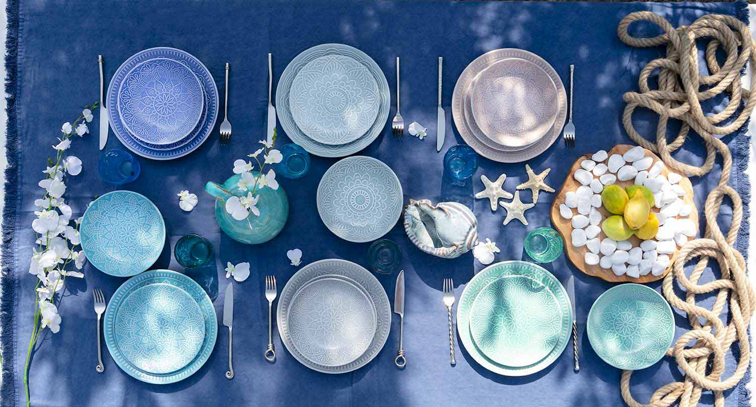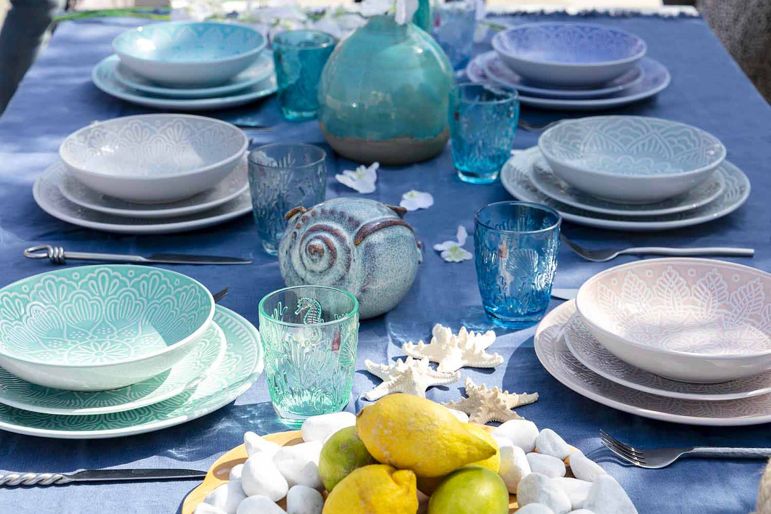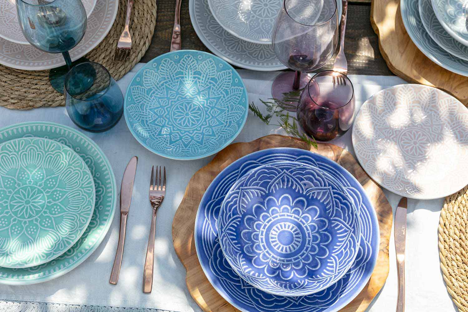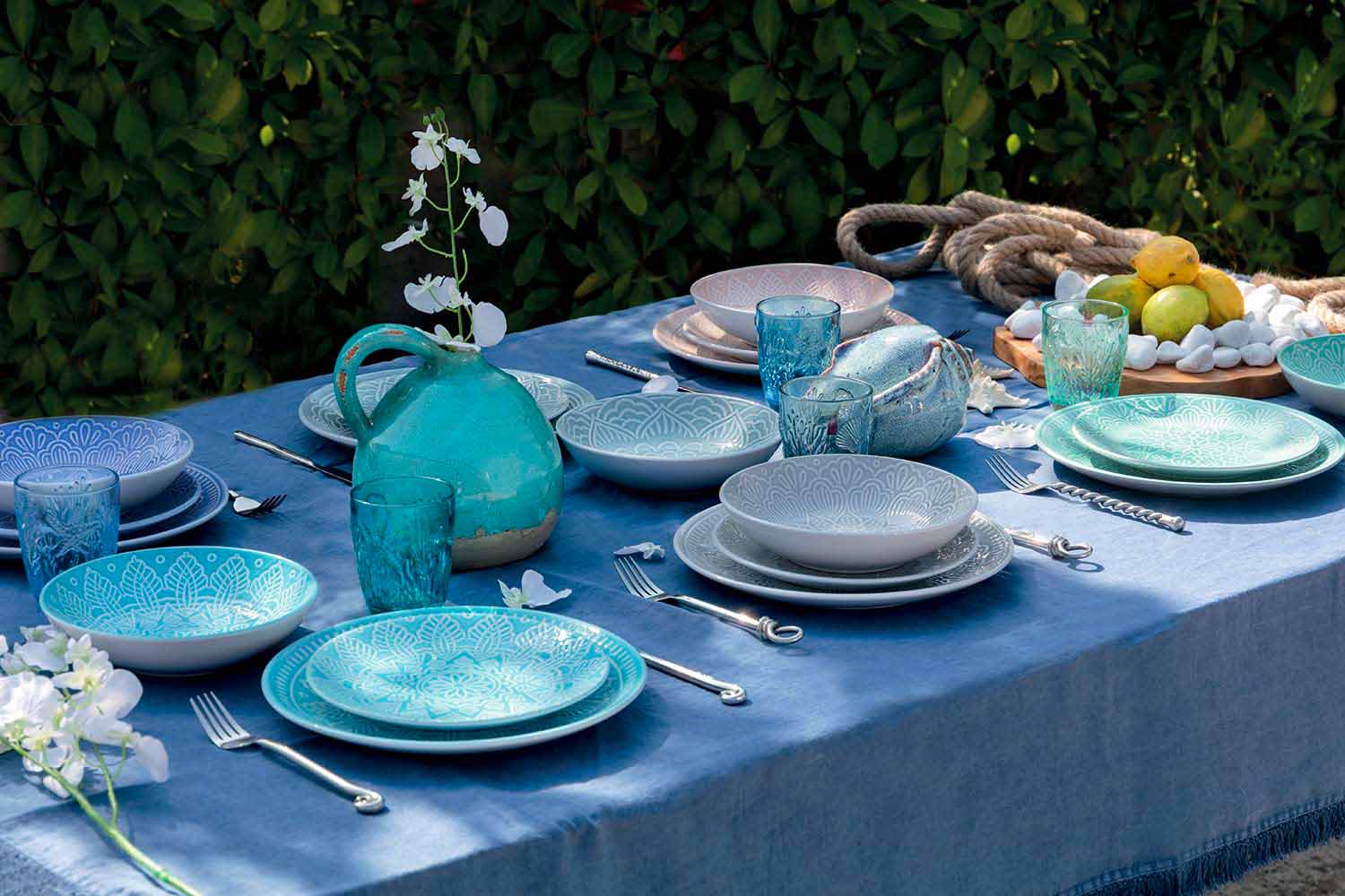 Sada barevných a moderních nádobí z kameniny doplněné 18-ti kusovým designovým stolem.