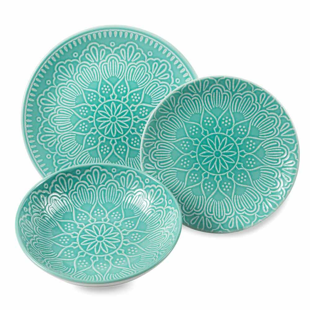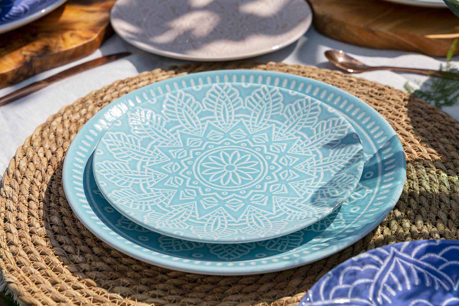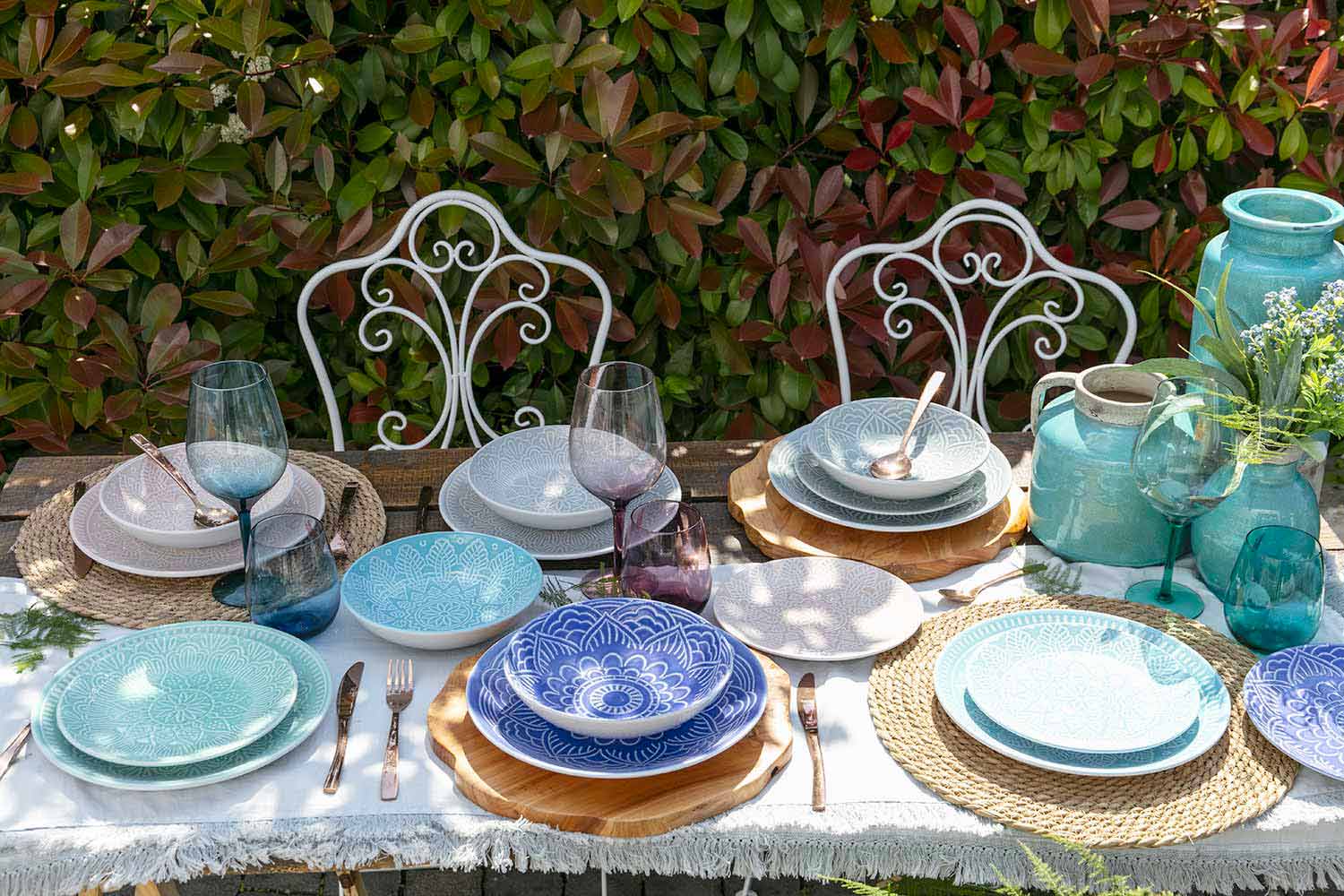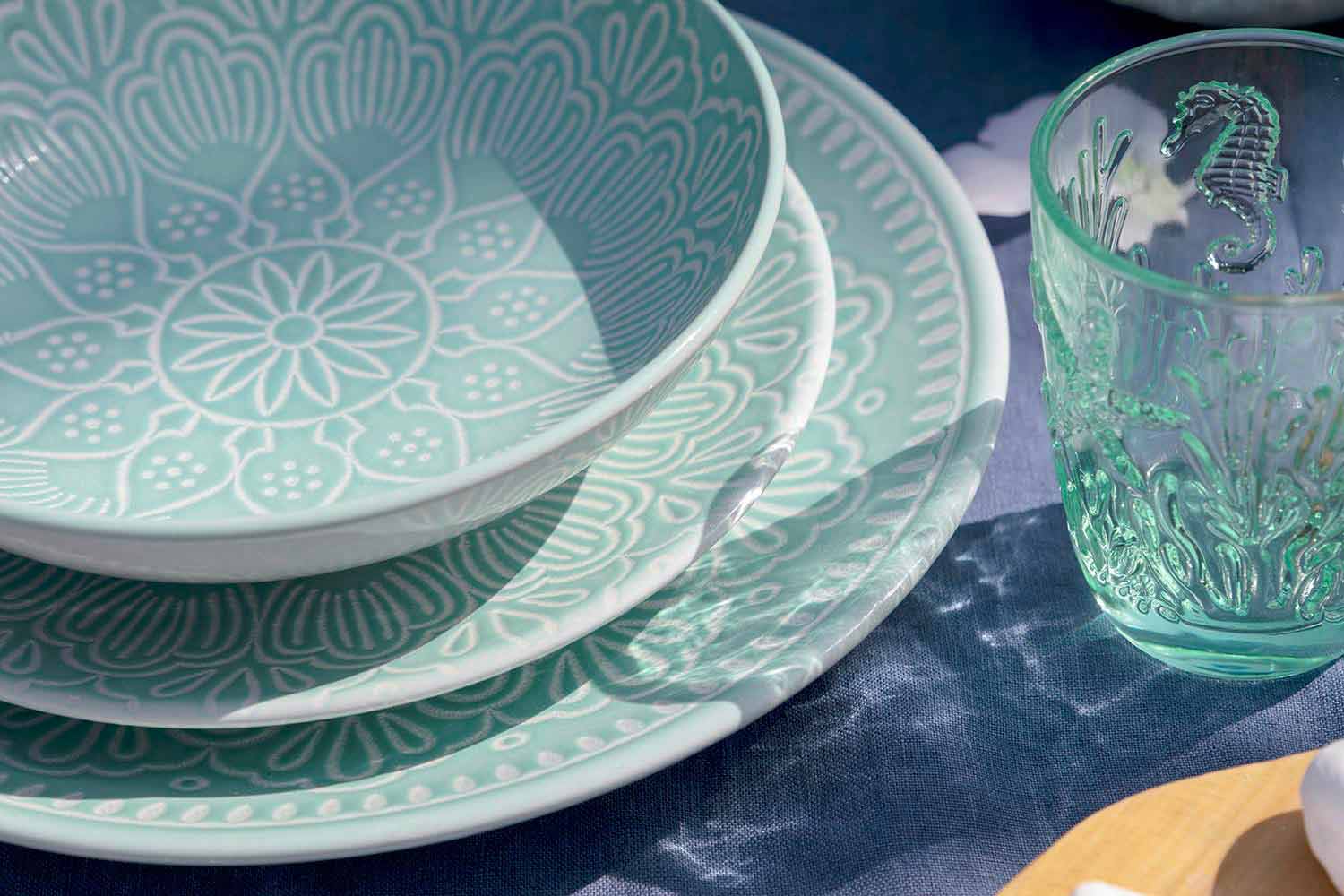 Sada barevných a moderních nádobí z kameniny doplněné 18-ti kusovým designovým stolem.