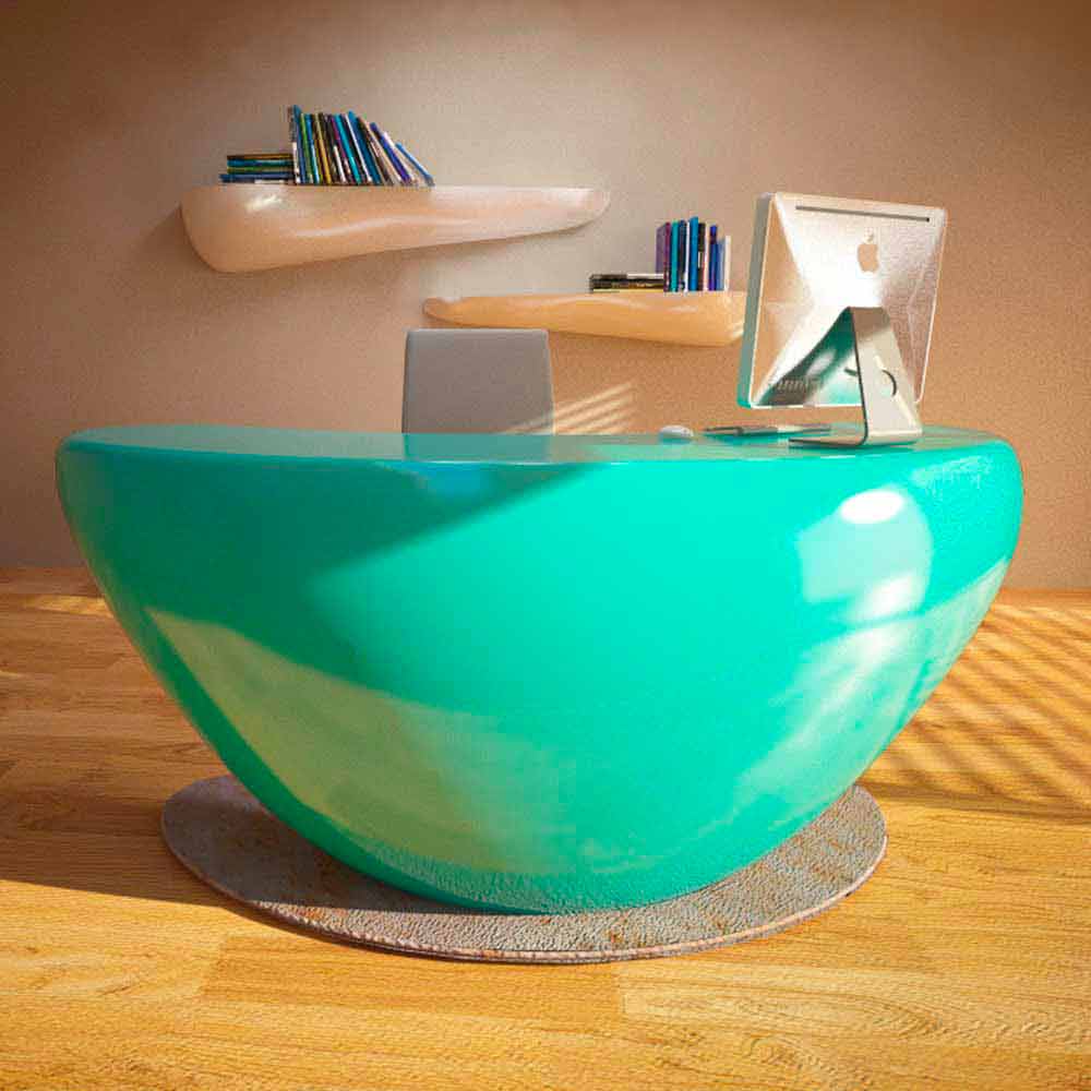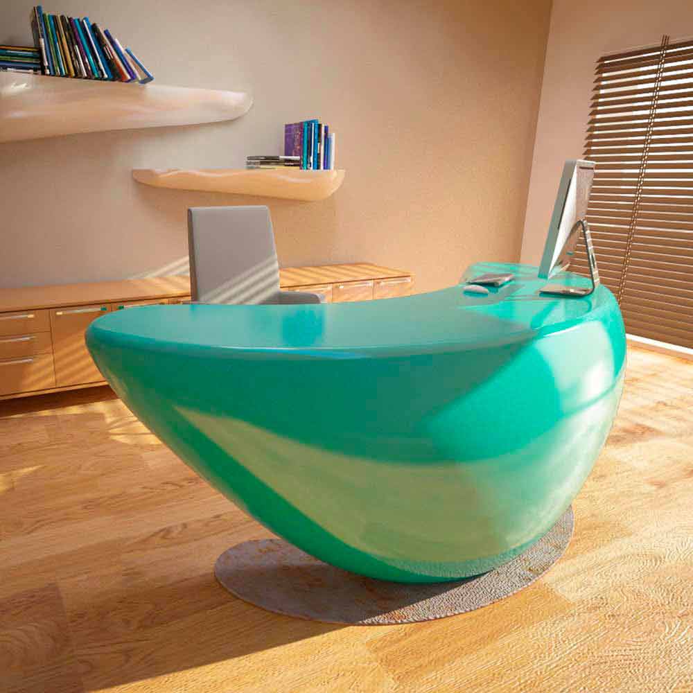 Kancelářský stůl Boomerang je interpretován jako designový doplněk, kolem kterého lze zařídit zbytek prostředí.