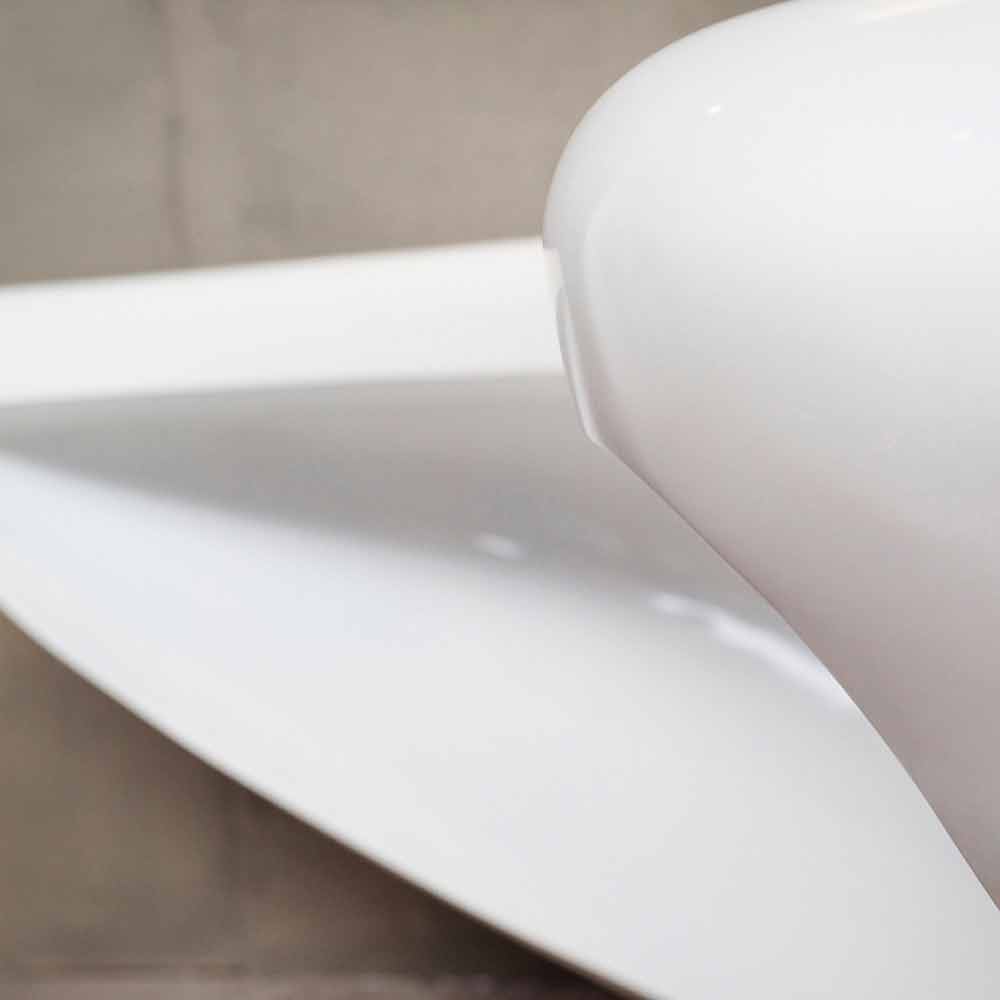 Důležitý a impozantní ve svém jedinečném monolitickém tvaru zobrazuje kontrastní řešení v lesklém laku v kombinaci s nosnou deskou ze surového železa.