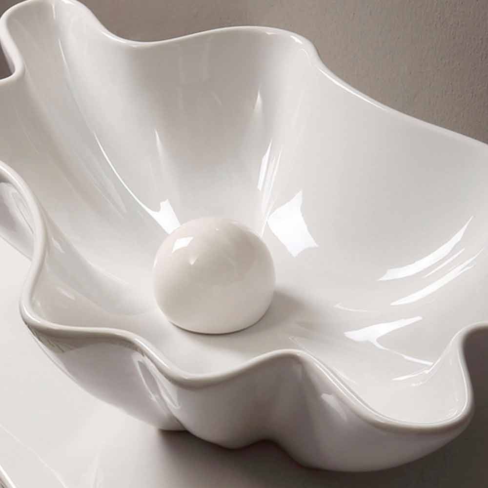 Umyvadlo, které díky perlovému odtoku připomíná moře, a vytváří tak iluzi, že je to ústřice.