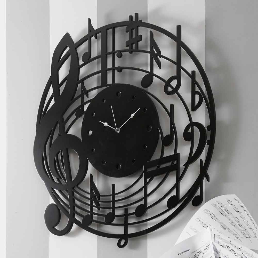 kulatými nástěnnými hodinami zobrazujícími noty.