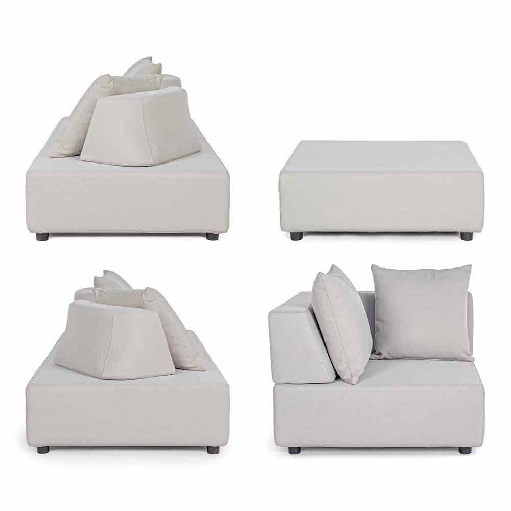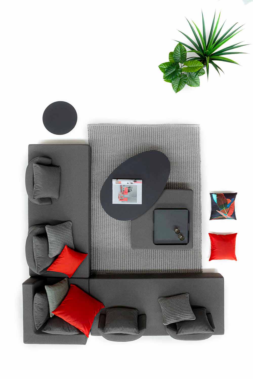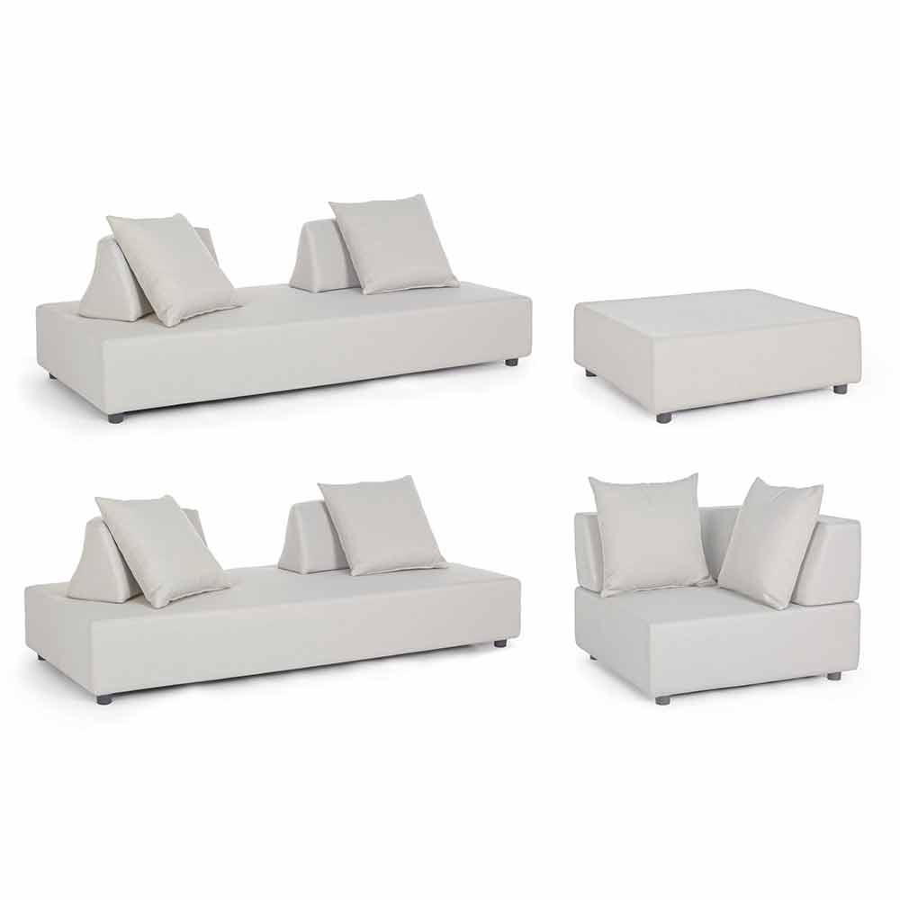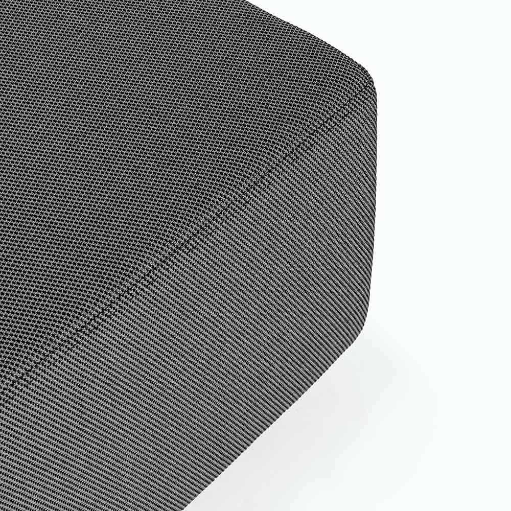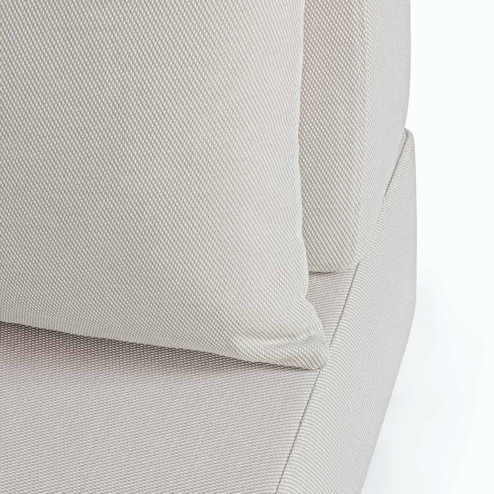 Sedadla, opěradla a polštáře s odnímatelným potahem v olefinové tkanině pro venkovní použití (100% polypropylen, 285 g / m2), odpuzující vodu a odolné vůči UV záření (stupeň 7), vnitřně vodotěsné potahem z textilu (polyuretan). Polstrovací sedák z polyuretanové pěny (38 kg / m3), opěradlo (20 kg / m3).