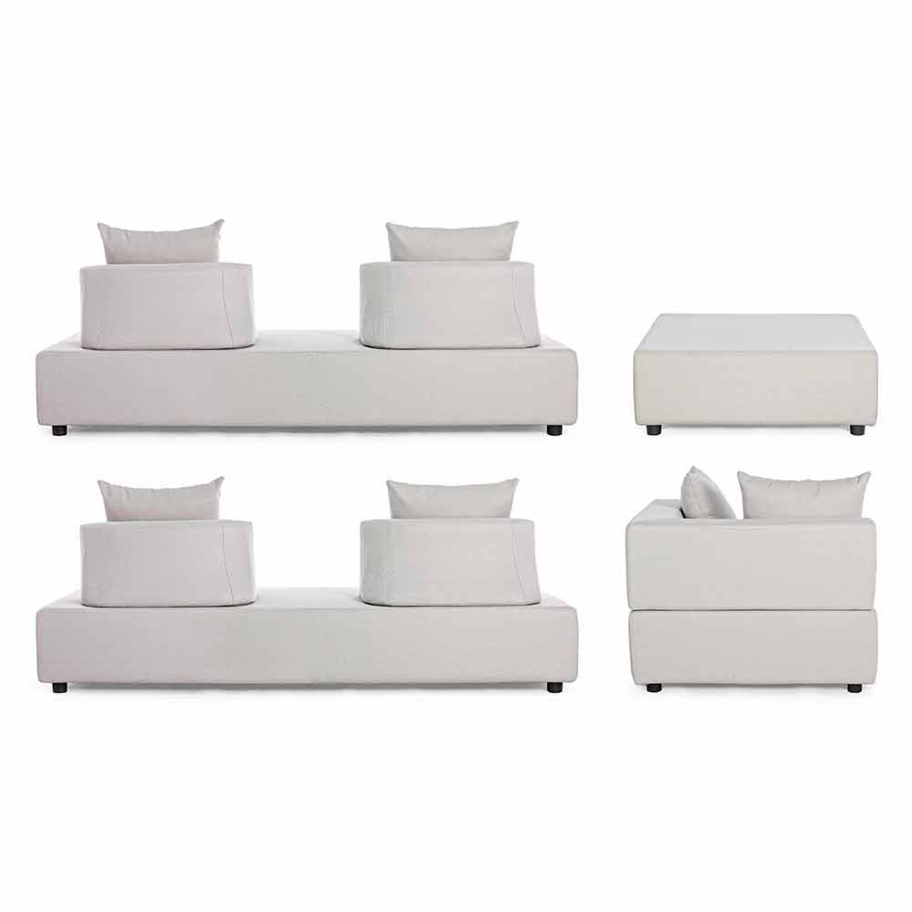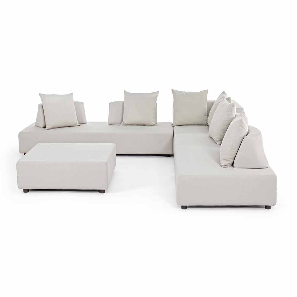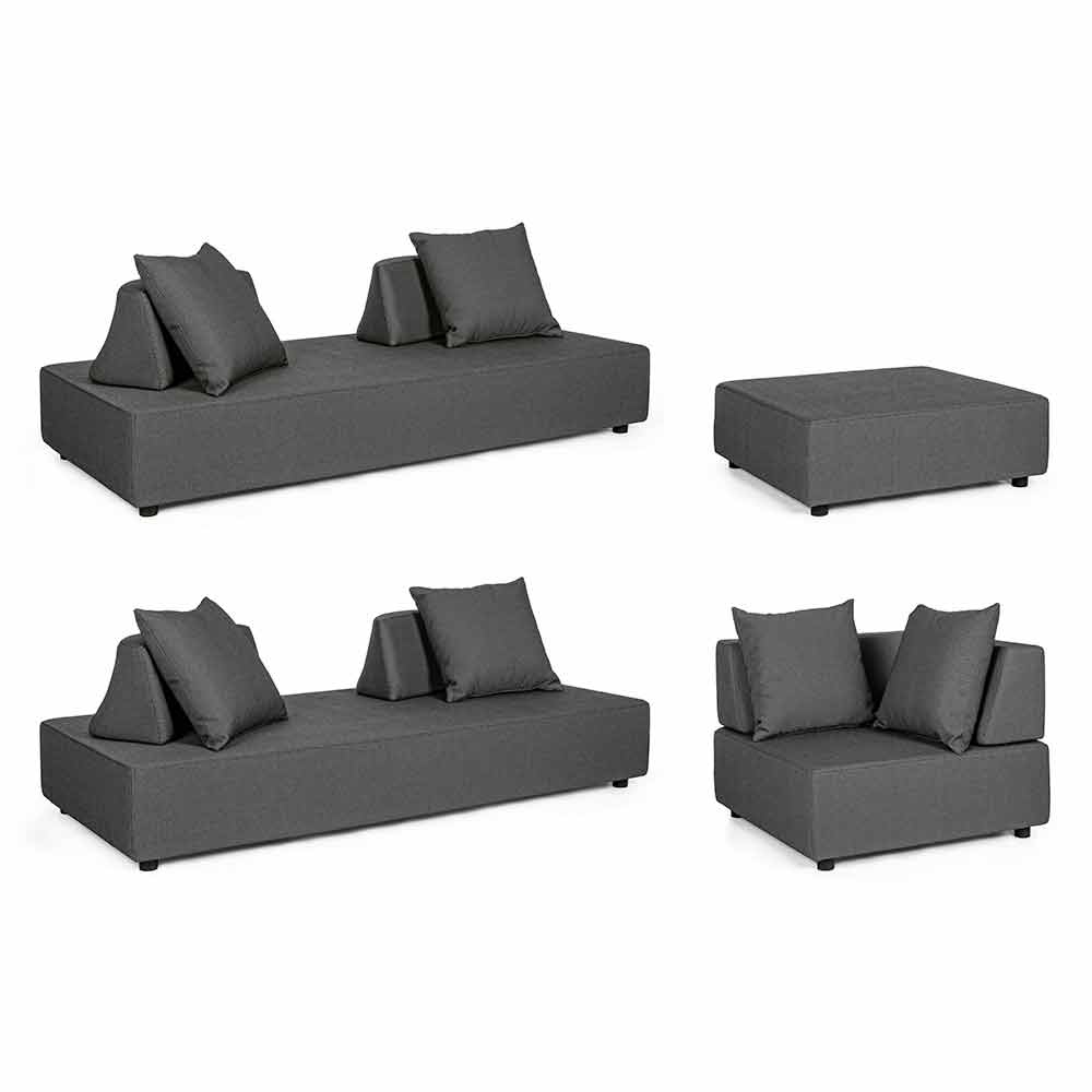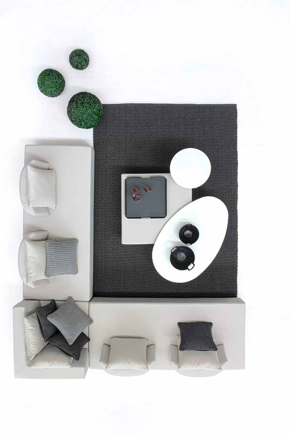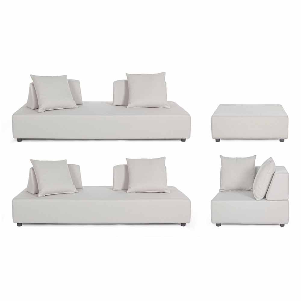 Sedadla, opěradla a polštáře s odnímatelným potahem v olefinové tkanině pro venkovní použití (100% polypropylen, 285 g / m2), odpuzující vodu a odolné vůči UV záření (stupeň 7), vnitřně vodotěsné potahem z textilu (polyuretan). Polstrovací sedák z polyuretanové pěny (38 kg / m3), opěradlo (20 kg / m3).