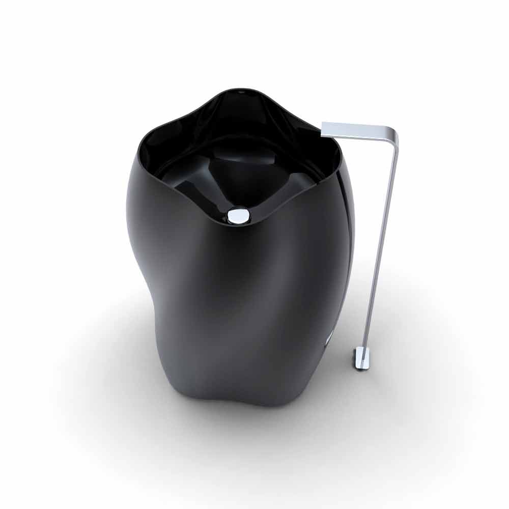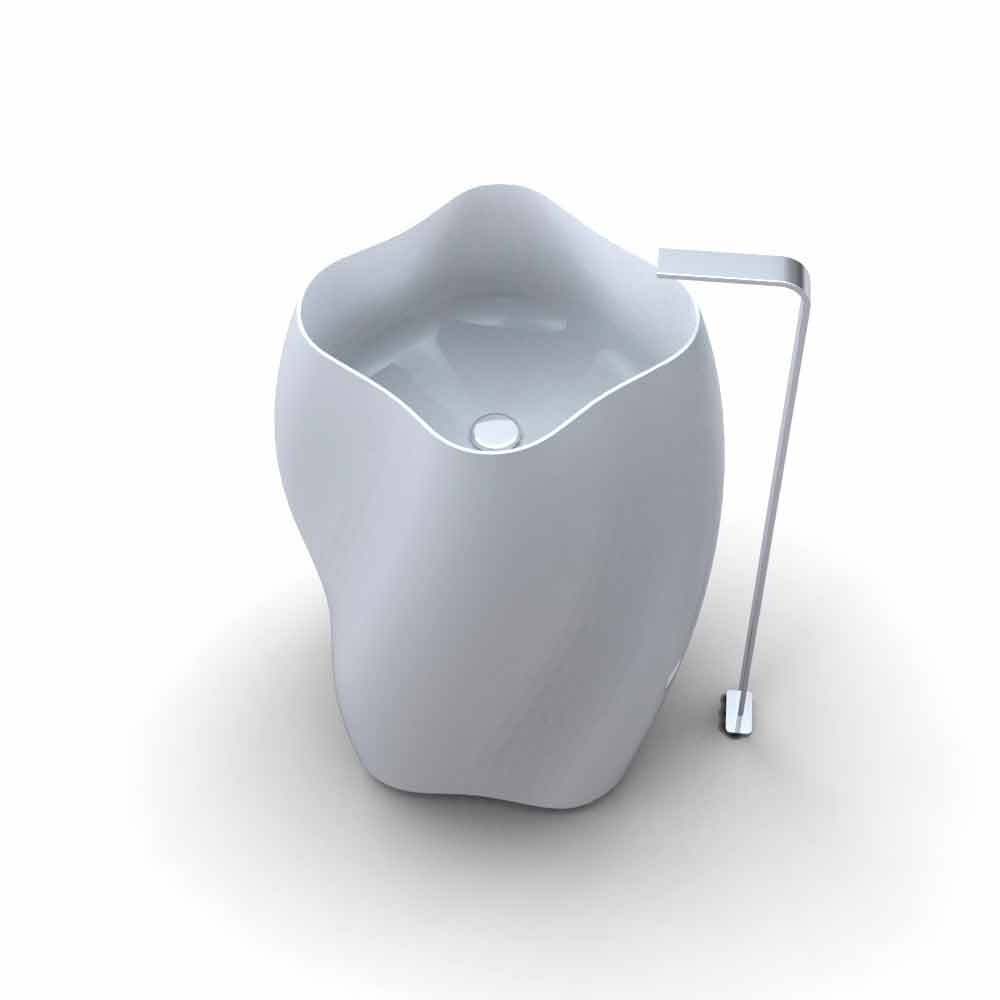 Volně stojící umyvadlo s vlnitými a organickými tvary, v provedení Solid Surface; Jeho linie ukazují profil, který připomíná siluetu "exotické" květiny. Kromě „vlnitého“ bočního profilu má na sobě charakteristický mírně „zkroucený“ tvar, který je směrem k vrcholu štíhlý, aby ukazoval singulární čtyřúhelníkovou mísu s laloky. Ten se prezentuje jako další charakterizační prvek a základní geometrický útvar, tvořící celou kompozici. Sanitární keramika má také dobrou ergonomii, protože je poměrně zaoblená, dostupná ve dvou různých barevných variantách: Bílá (RAL9003) nebo Černá (RAL9005).
