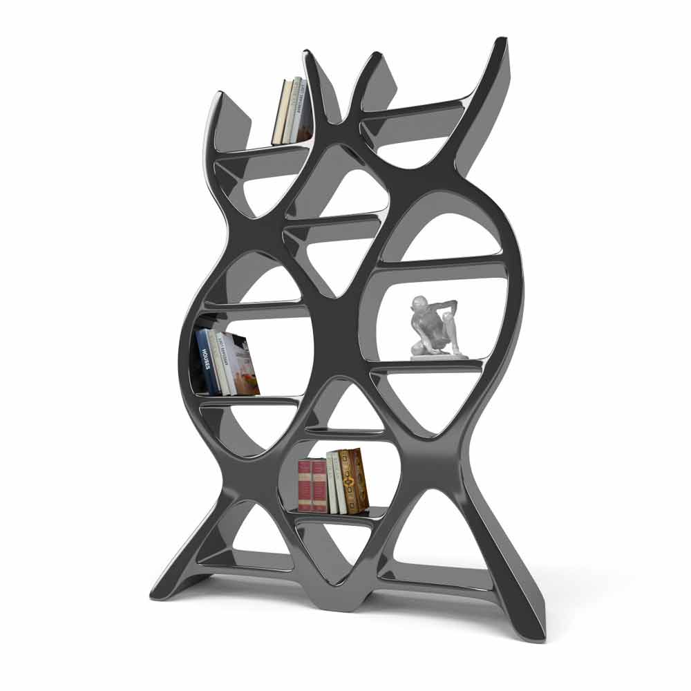 Za knihovnou, socha inspirovaná DNA, zdroj života a poznání. Jemné a klikaté linie v kombinaci se silným scénickým dopadem činí knihovnu DNA vhodnou jako exkluzivní kus nábytku v domácnosti. Díky svým neobvyklým tvarům je také ideální pro prostředí určená pro literární bary nebo kavárny. Struktura Solid Surface, dostupná v různých barvách: černá (RAL9005), rubínově červená (RAL3003) nebo perleťově bílá (RAL1013).