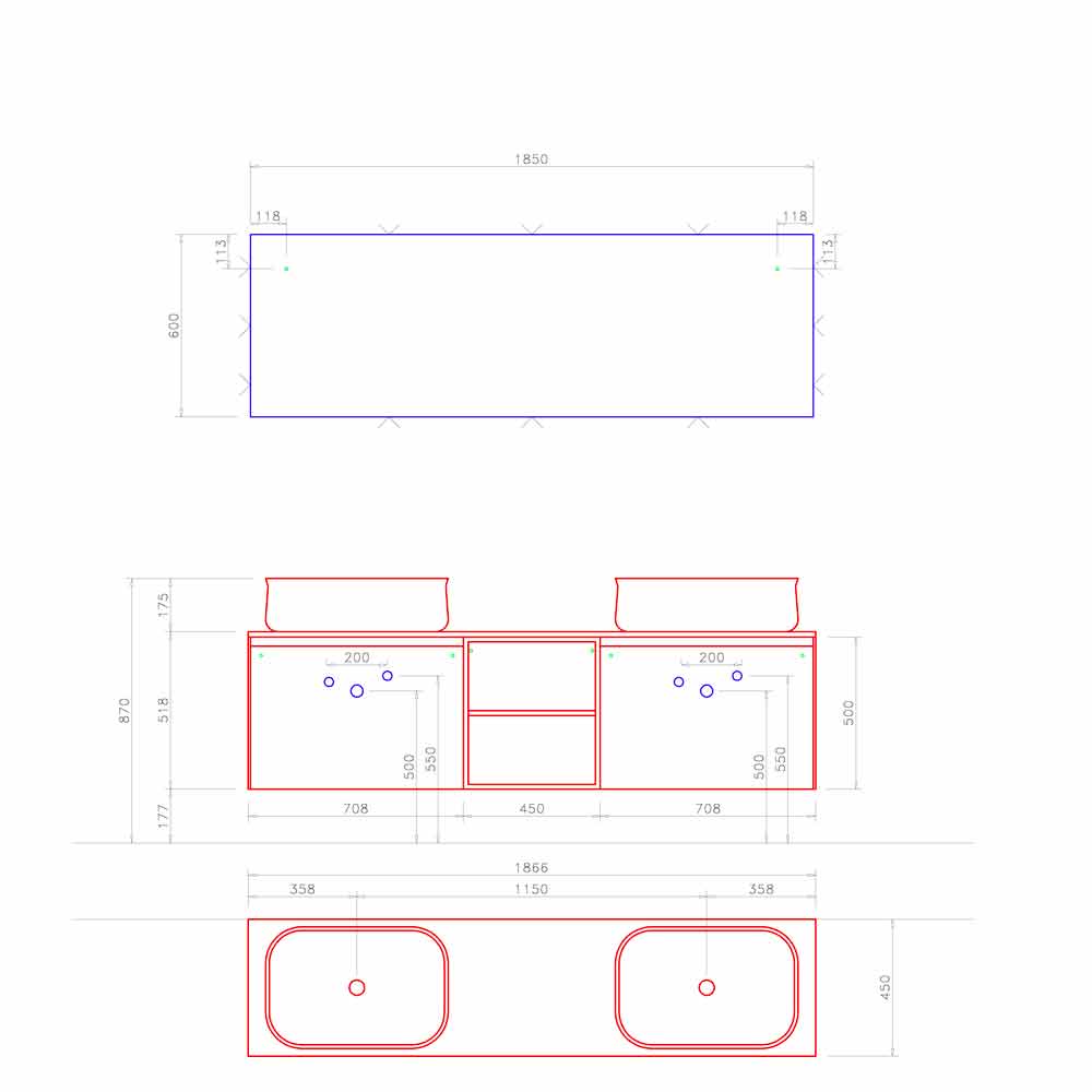 Jedná se o moderní a symetrickou kompozici koncipovanou s dvojitým umyvadlem a nástěnnou jednotkou oddělenou otevřenou policí, která udržuje design čistý a uklizený.