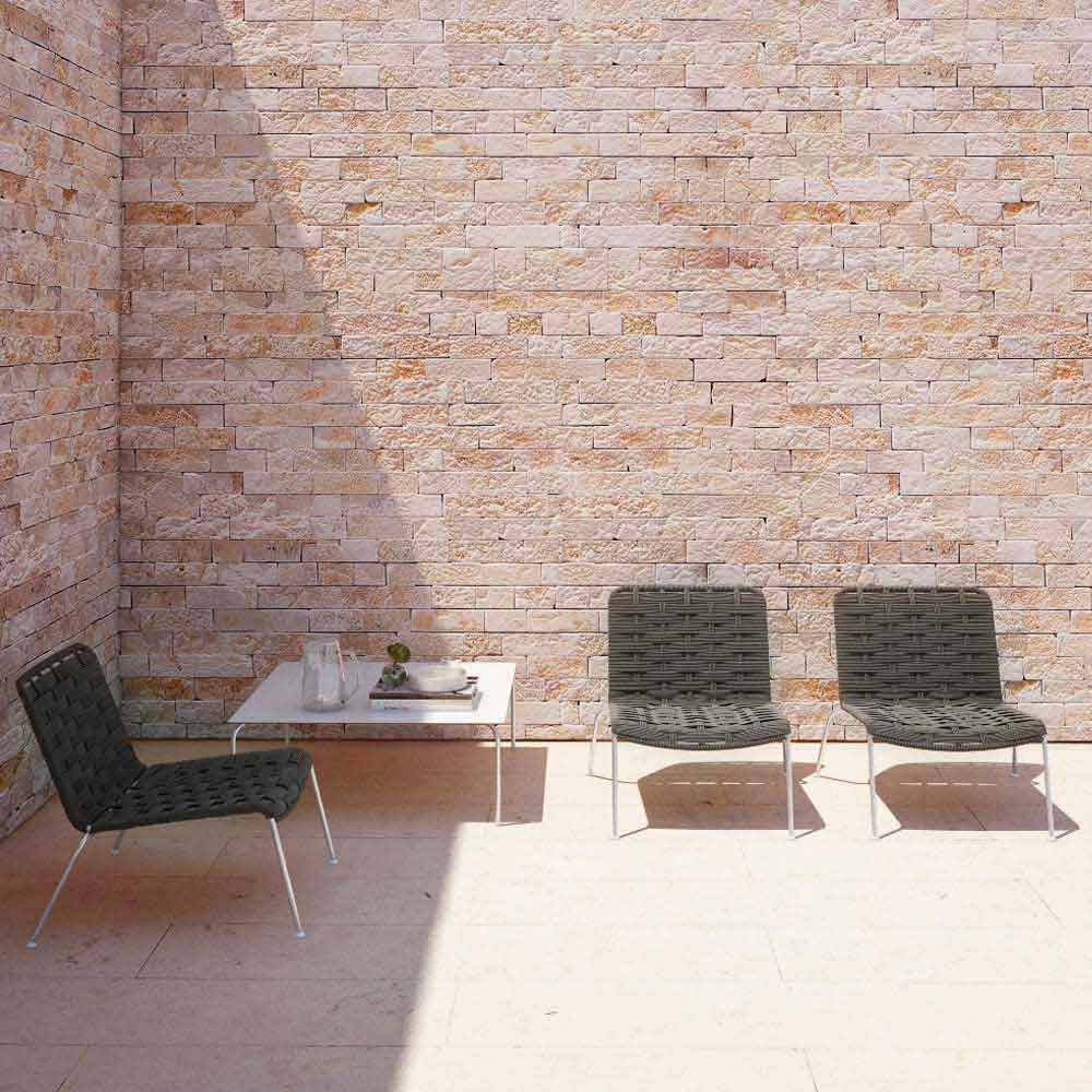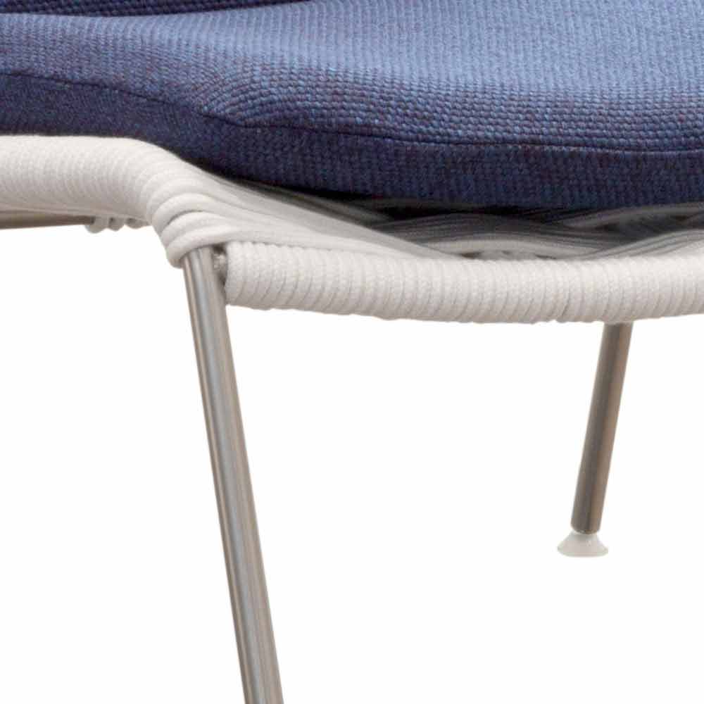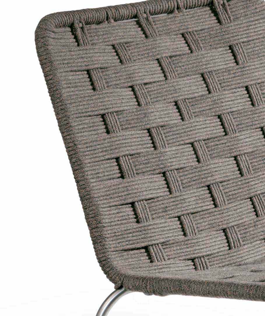 Jedná se o malé křeslo se saténovou konstrukcí z nerezové oceli. Sedák a opěradlo tkané v akrylové šňůře s možností výběru mezi barvami: