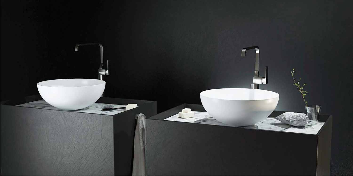 Donnas je volně stojící umyvadlo z pevného povrchu s kruhovým půdorysem.