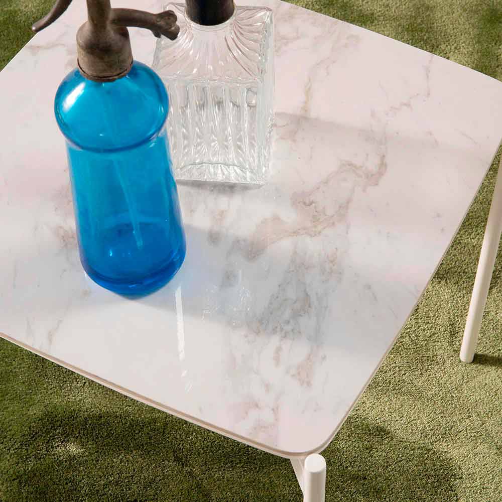 Nízký konferenční stolek moderního designu s keramickou deskou a kovovou konstrukcí.