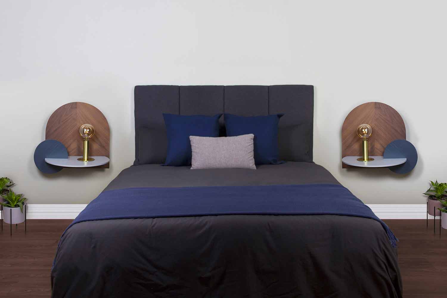 Tento modulární noční stolek představuje inovativní a originální nápad, který dokáže podmanit si každou pozornost uvnitř místnosti díky svému jedinečnému stylu a kombinaci materiálů a povrchů, které dodávají eleganci a mimořádně moderní design . Jeho strukturu tvoří 3 překližkové panely, jeden v provedení z ořechového dřeva a dva v barvě modré a šedé barvy popela . Panel, který funguje jako skutečný nosný povrch, je připevněn ke stěně a jsou na něj namontovány 2 modulární panely, které lze umístit do 8 různých konfigurací, čímž se získá produkt, který lze přizpůsobit podle jeho potřeb a prostor. Struktura má také otvor pro kabel umístěný za předním panelem, který umožňuje jejich skrytí a noční stolek je ještě funkčnější a praktičtější. Mezi svislými panely a stěnou je 9 cm přihrádka, kterou lze použít k ukládání a organizaci knih a časopisů nebo jiných předmětů, a optimalizovat tak dostupný prostor na maximum.