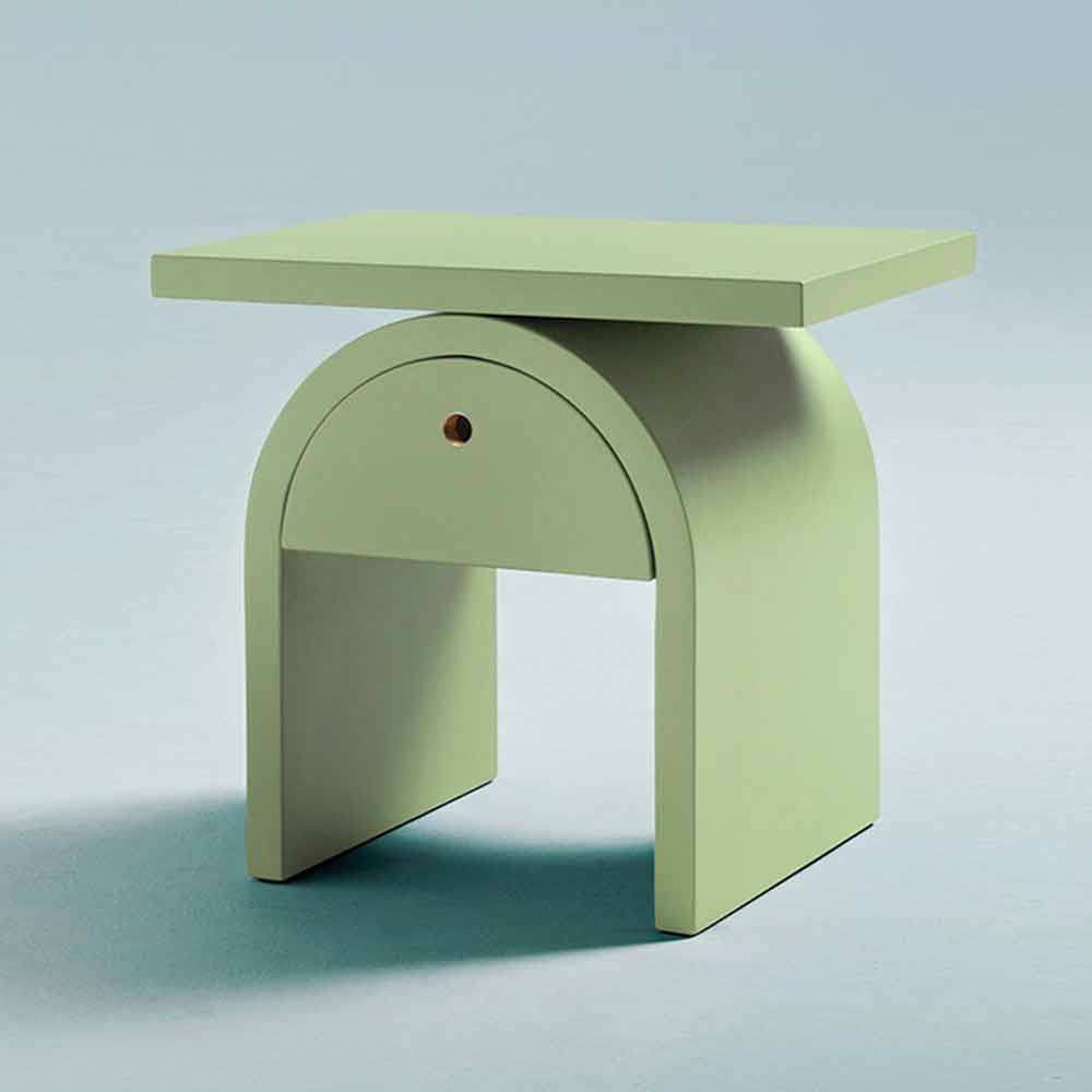 Moderní reinterpretace tradičních tvarů nočního stolku pro malou, ironickou a lehkou domácí architekturu.