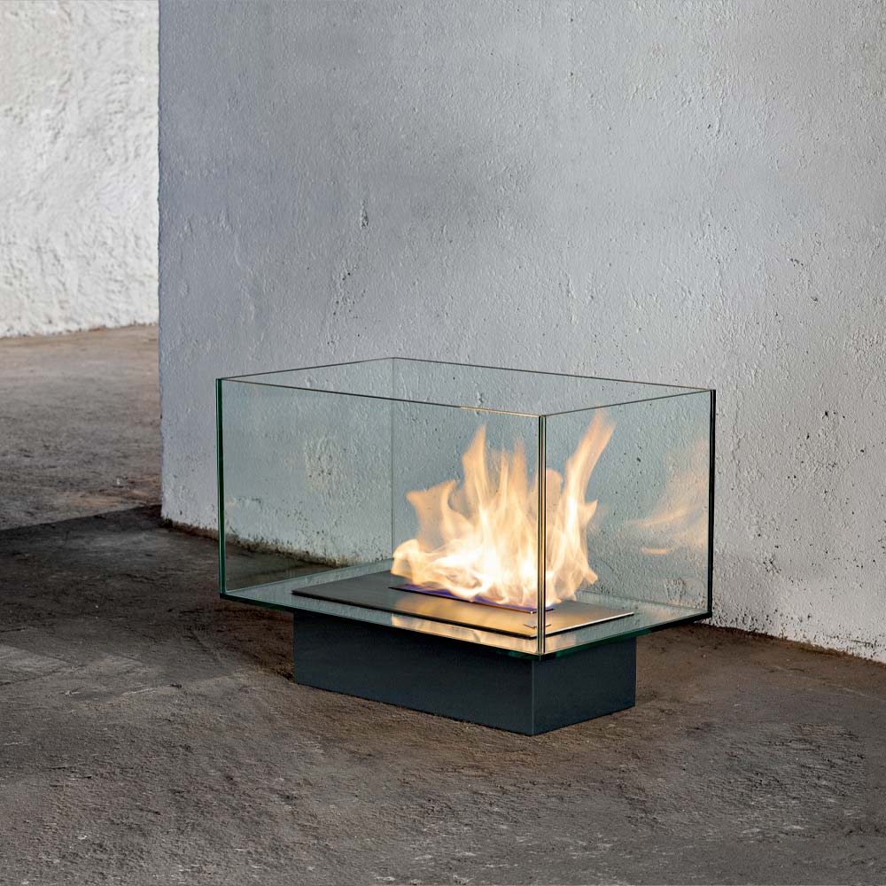 průhledného obdélníkového skleněného prostoru, který obsahuje plamen, vytváří jakési návaznosti na okolní prostředí a stává se protagonistou díky malému