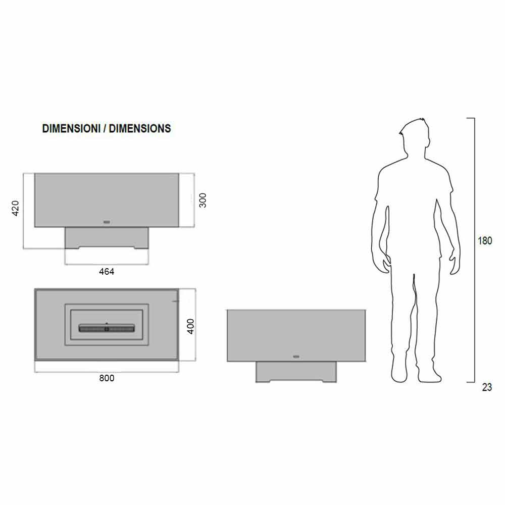 Podlahový krb na bioethanol s moderním designem ze skla s ocelovou nebo cortenovou deskou, pro vnitřní použití, vyrobený v Itálii.
