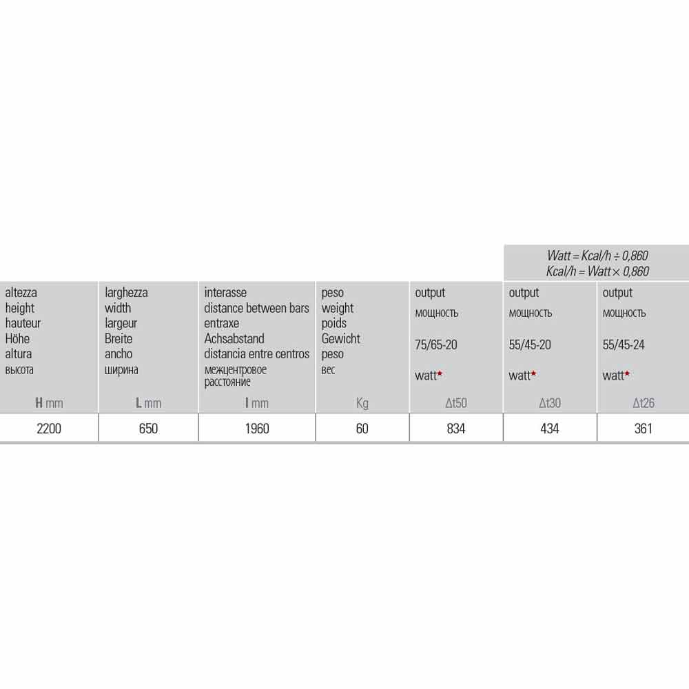 Velikost: H 2200 x L 650 x Inter. 1960 mm x Výkon Δt50 834 W, Δt30 434 W, Δt26 631 W