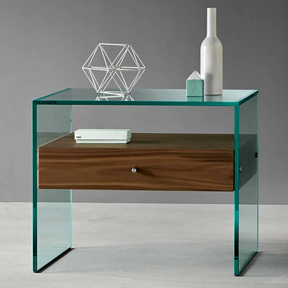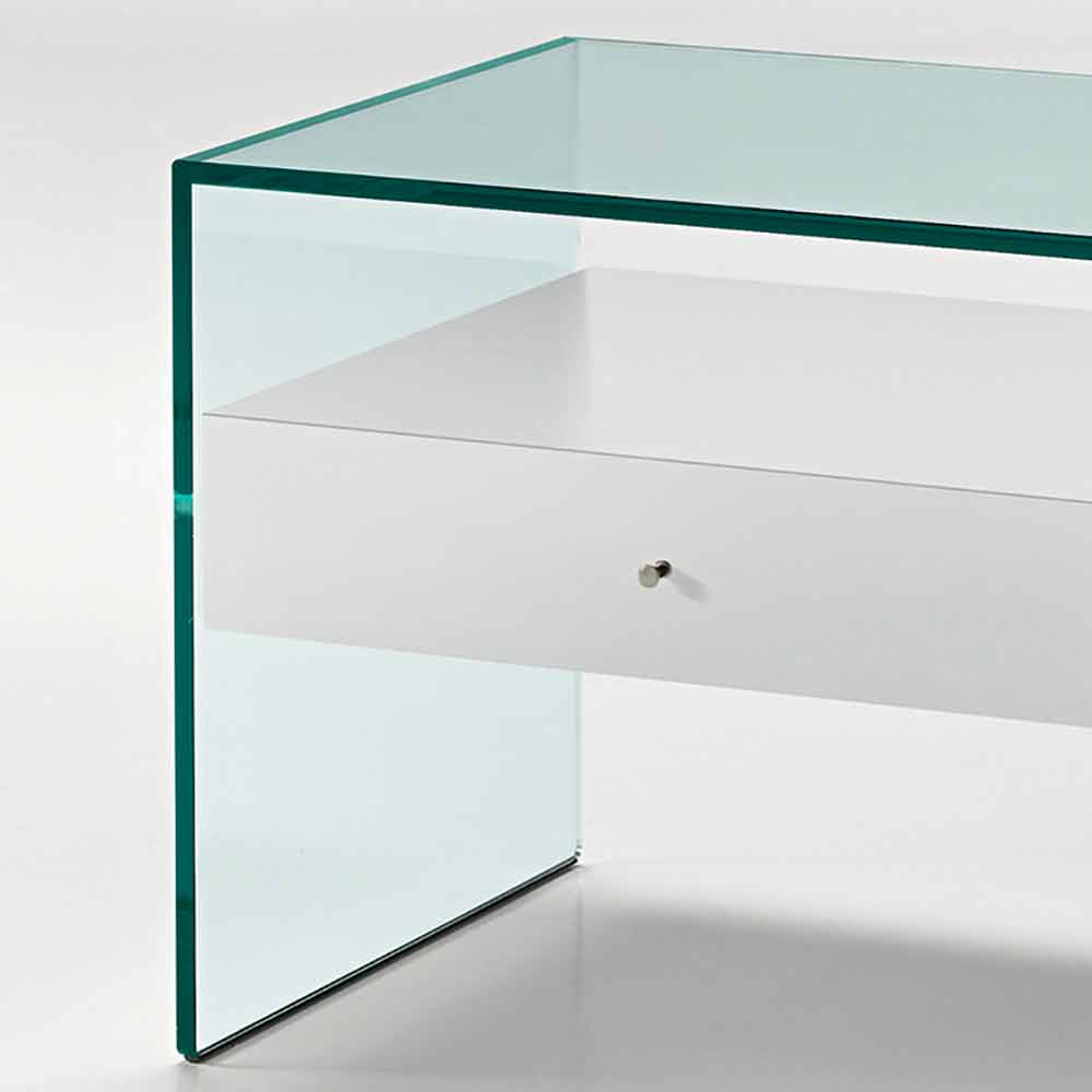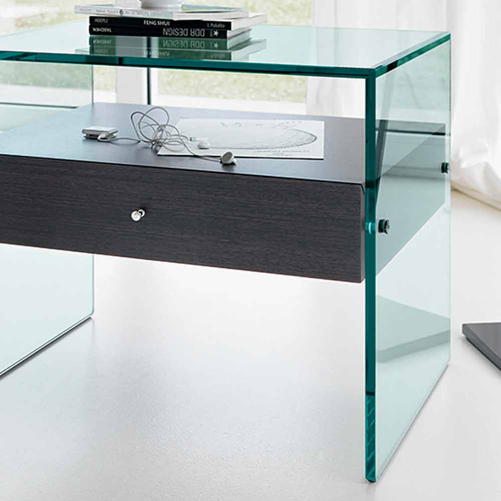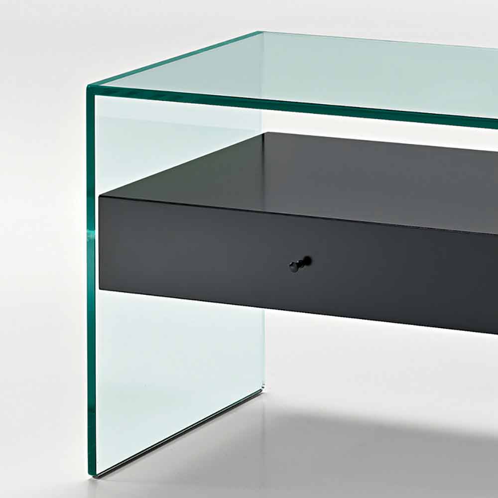 Moderní designový stolek z extra jaderného skla se zásuvkou ze dřeva, ručně realizovaný v Itálii.
