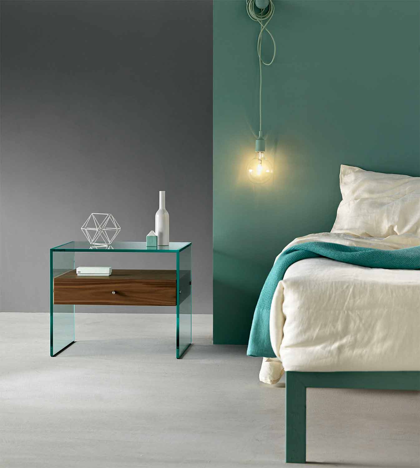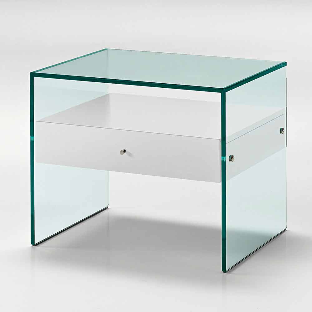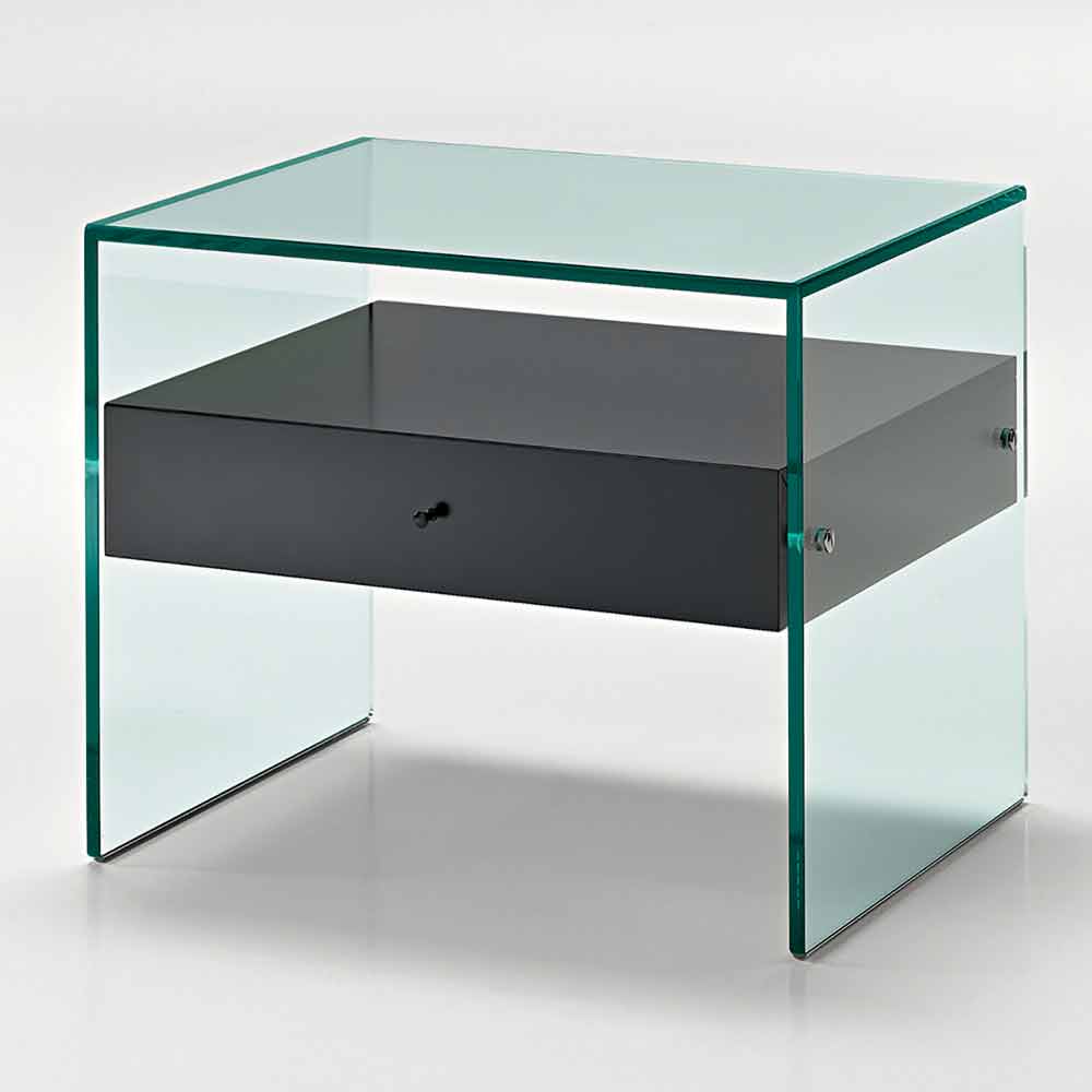 Moderní designový stolek z extra jaderného skla se zásuvkou ze dřeva, ručně realizovaný v Itálii.