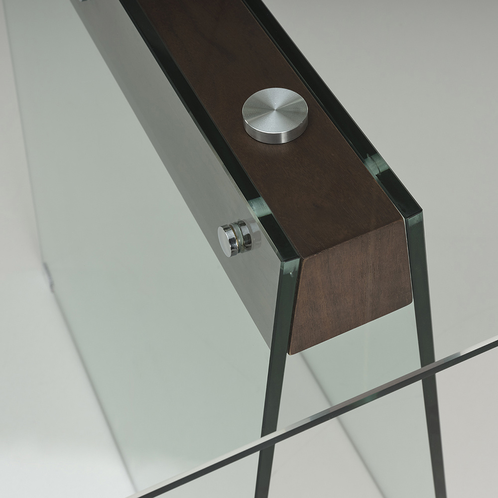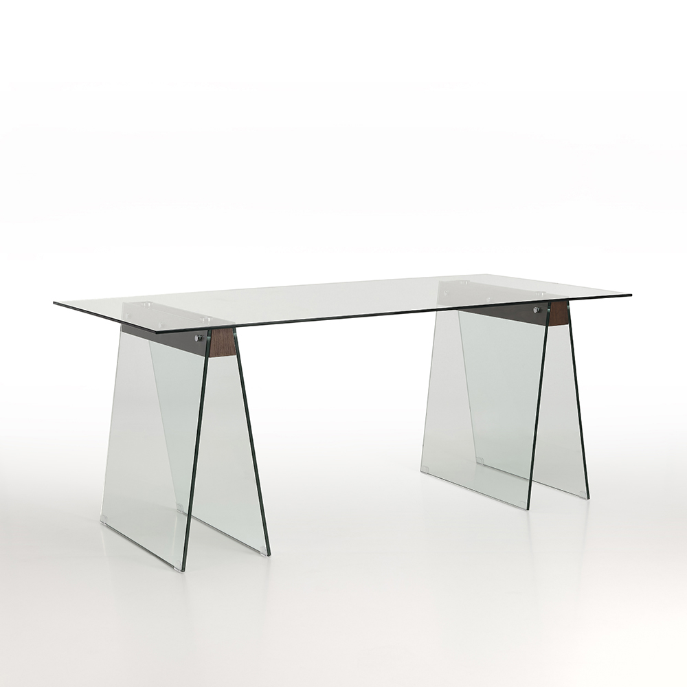 Losanna je moderní stůl s nohami z čirého skla a 12 mm silnou deskou z čirého skla s výplněmi z MDF v barvě ořechu.