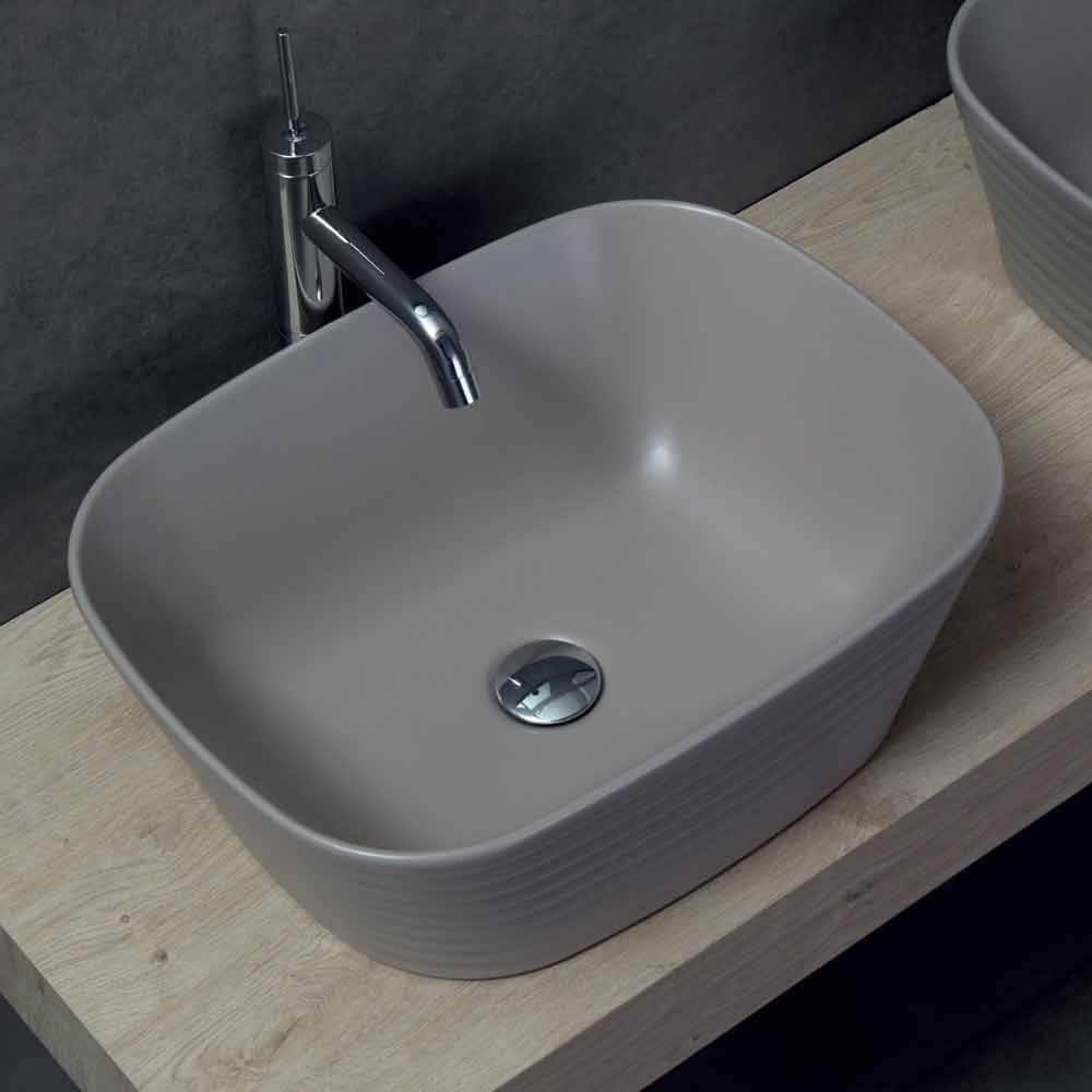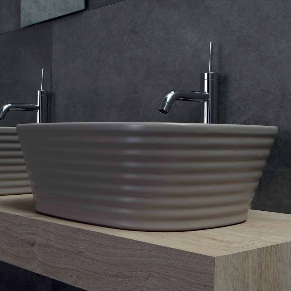 Umyvadlo na desku Trabia je schopno ocenit povrch nebo nábytek, na kterém je umístěno. Jeho design je jednoduchý, ale s pečlivou pozorností k detailům. Může být použit bez obav z poškození povrchu, díky materiálu, ze kterého je složen, sklovému porcelánu . Tento materiál je druh zasklené keramiky vařené při 1200 °, odolný vůči kyselinám, teplu, nárazům a škrábancům. Je hygienický a snadno se čistí a v průběhu času také nezmizí.