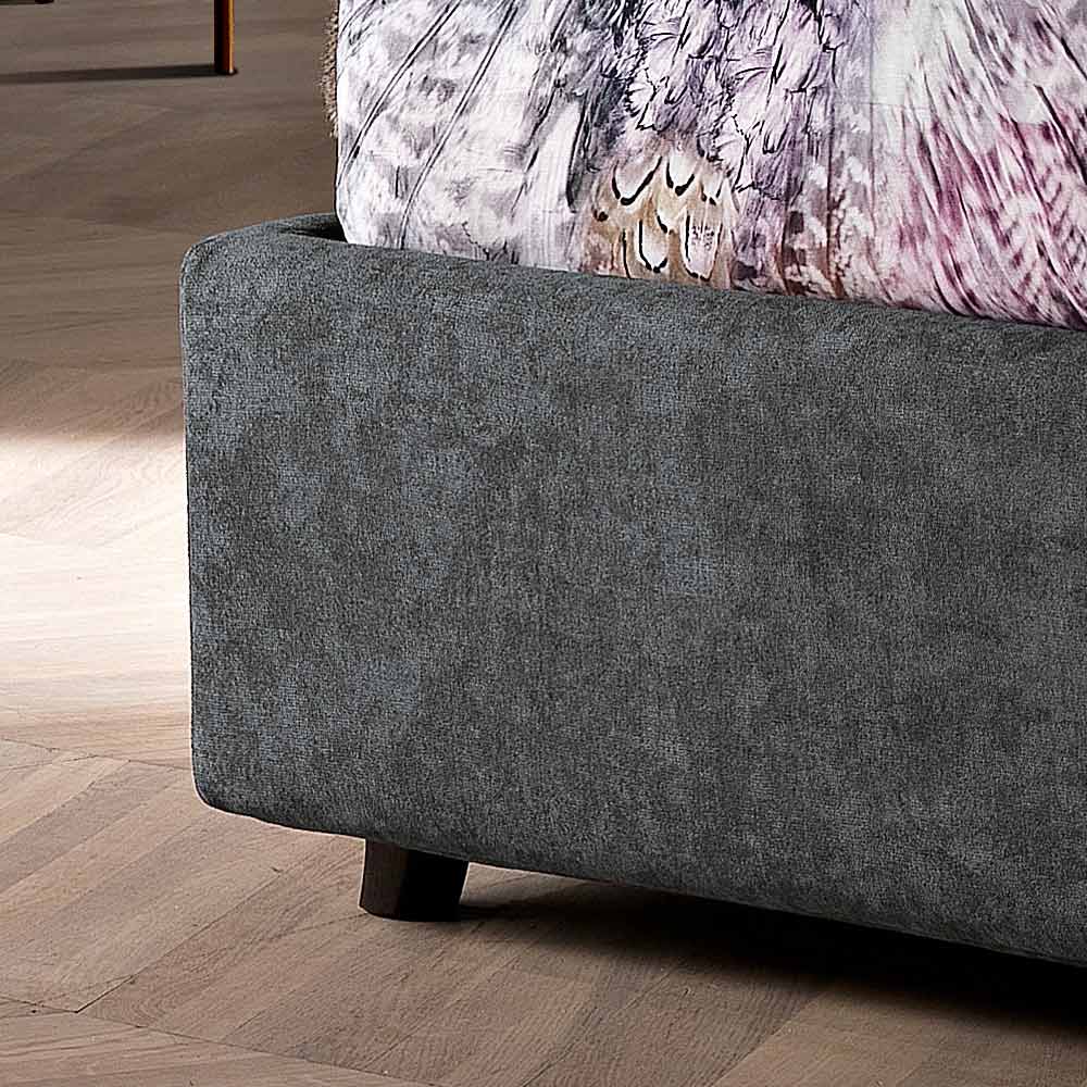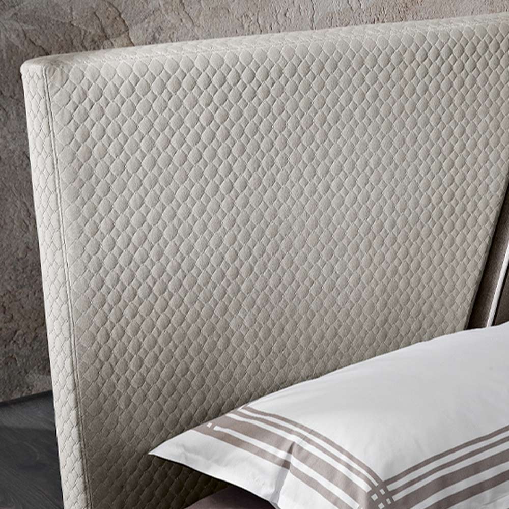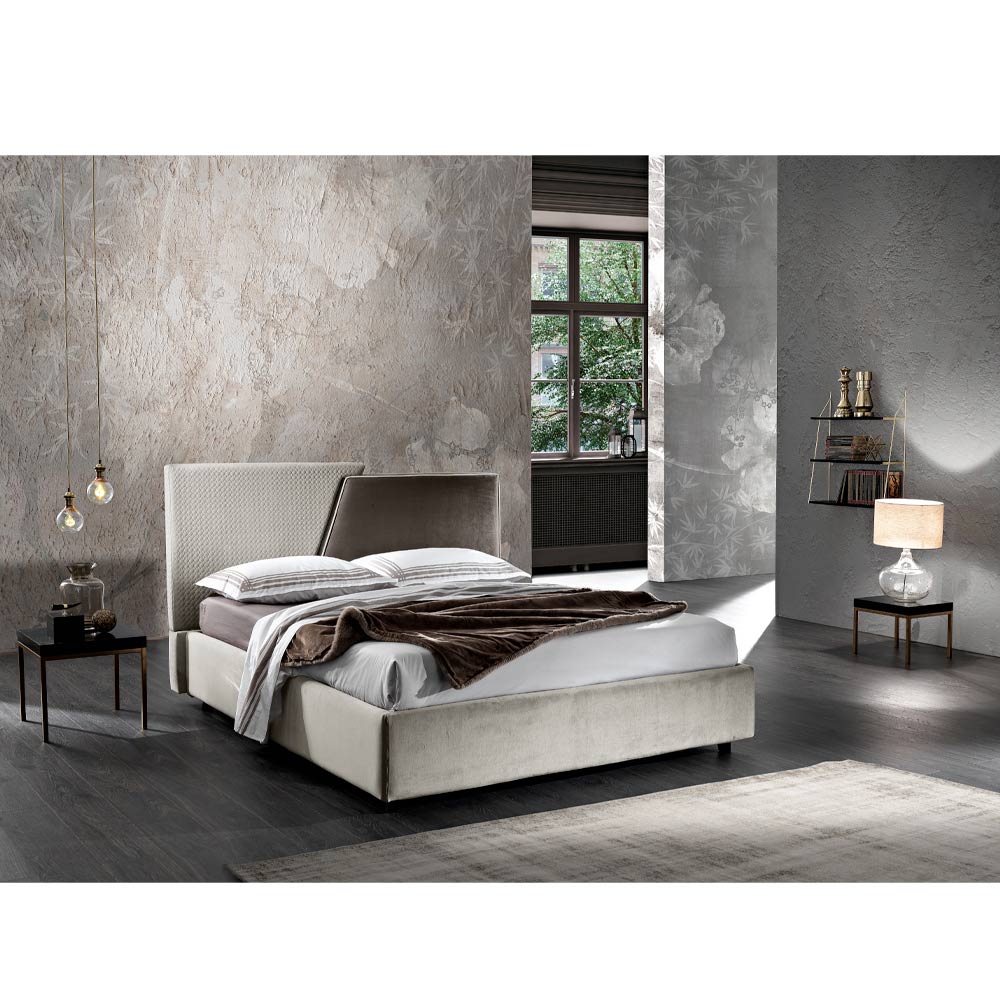 Manželská postel vyniká svým designem složeným z diagonálních linií a rozhodných tvarů, které připomínají modernu. Přizpůsobí se jakémukoli kontextu a stylu zařízení díky možnosti kombinace dvou různých odstínů různých látek, díky čemuž je jedinečná a snadno se kombinuje.