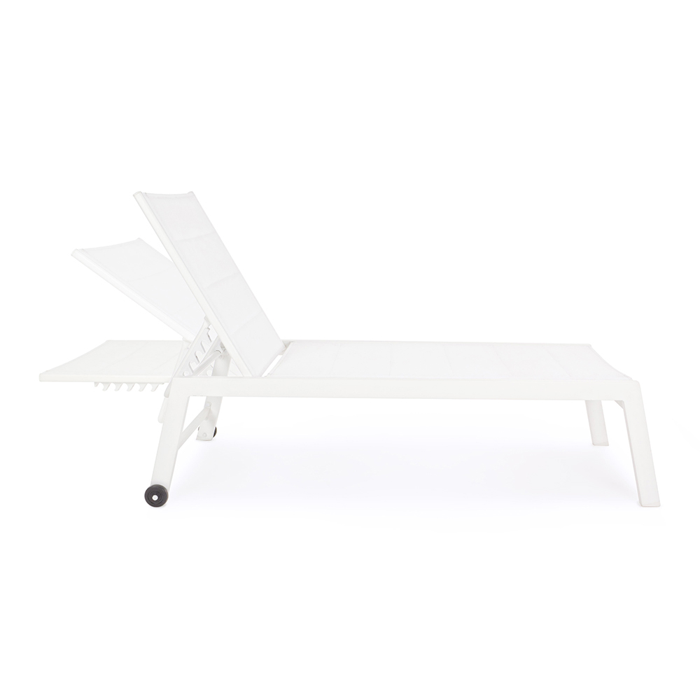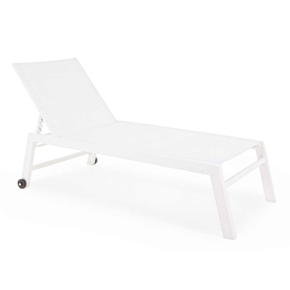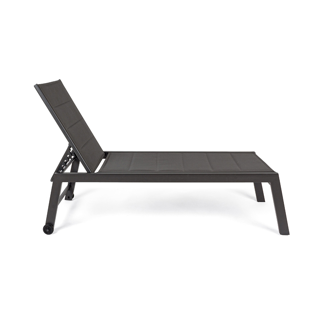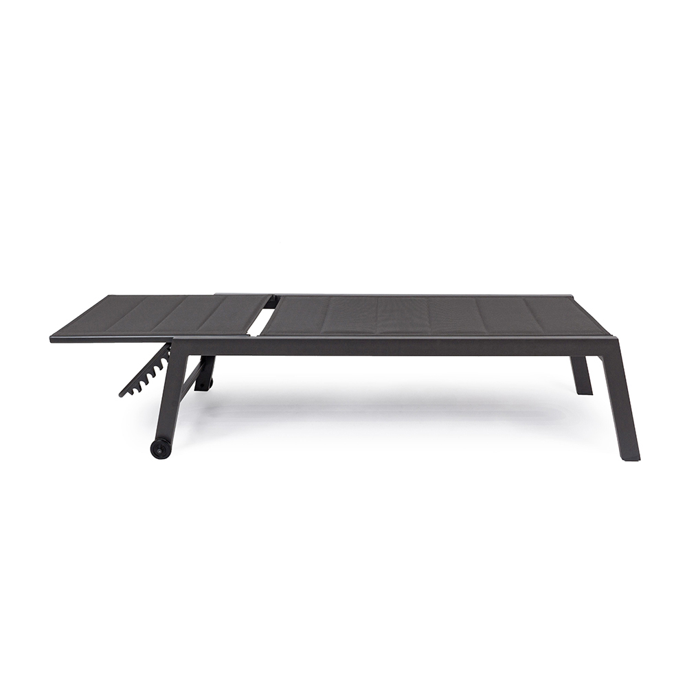 Zahradní design lehátko vyrobené z hliníku a vybavené kolečky pro venkovní použití.