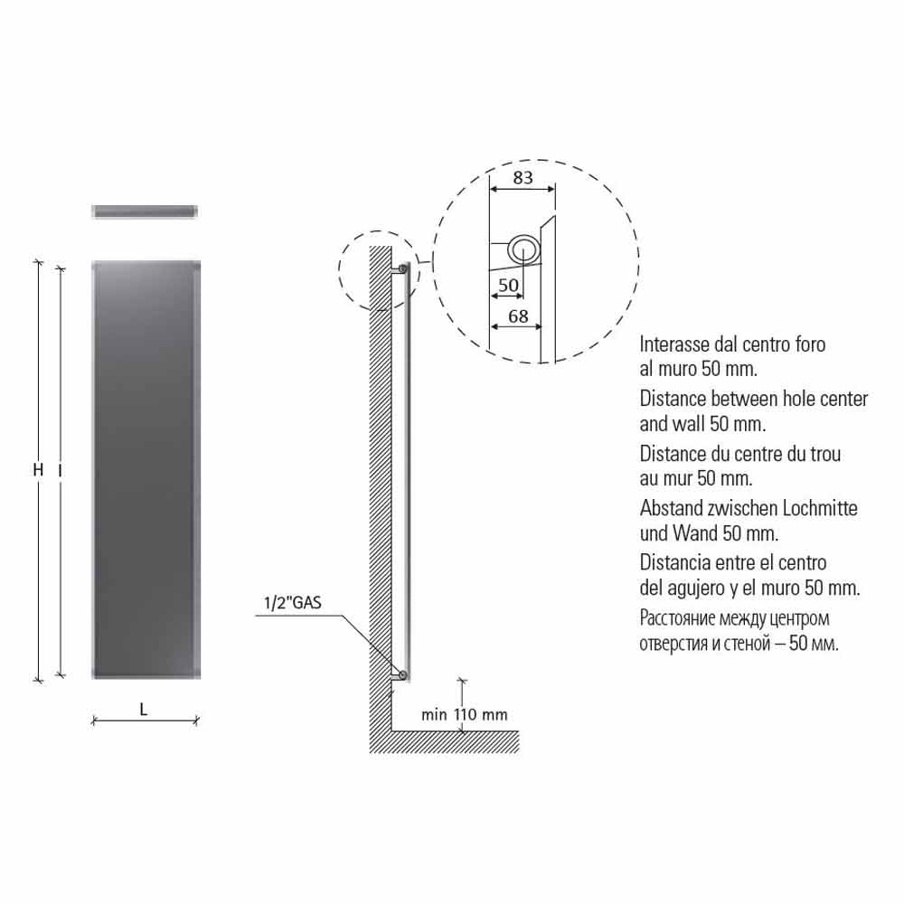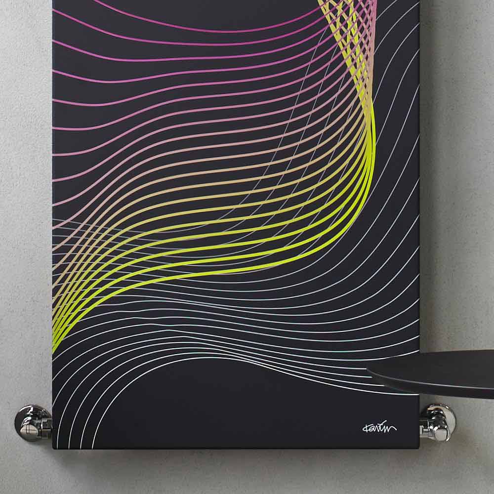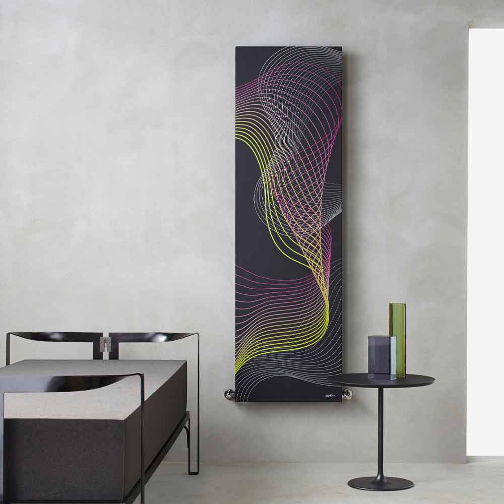 Designový radiátor ve svislé ocelové stěně, vyrobený v Itálii.