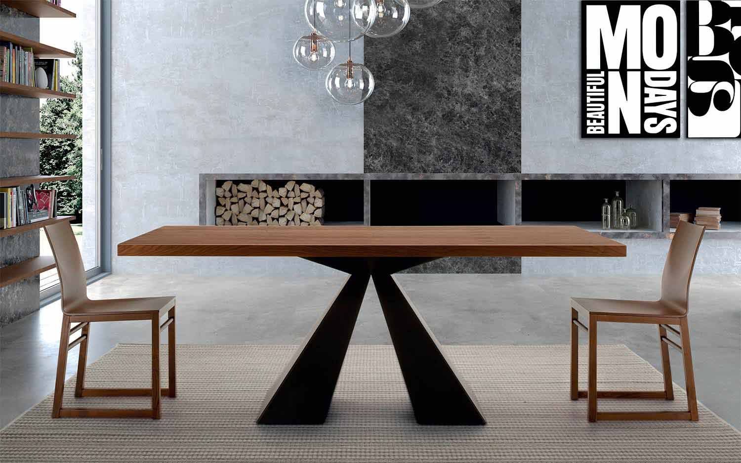Designový kuchyňský stůl z ořechového dýhovaného dřeva a černé ocelové podnože vyrobený v Itálii.