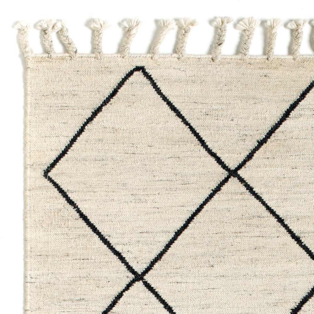 geometrický vzor v odstínech černé, který dodává modernost, spolu s třásněmi, které pokrývají dvě kratší strany koberce. Použité materiály a techniky umožňují získat vysoce kvalitní finální produkt, který dokáže na sebe upozornit, čímž je každé prostředí jedinečné.