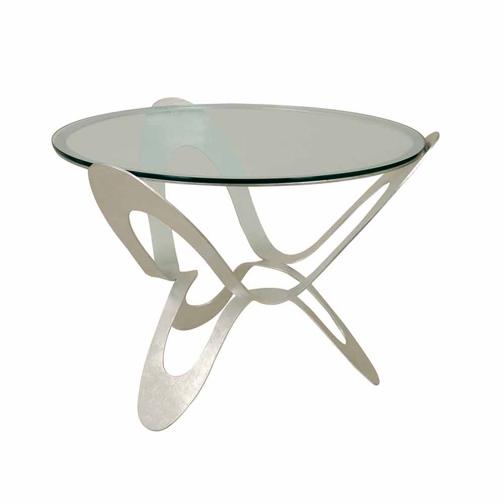 Nízký kulatý konferenční stolek vyráběný v Itálii ručně vyráběný ze skla a zlata nebo stříbra.