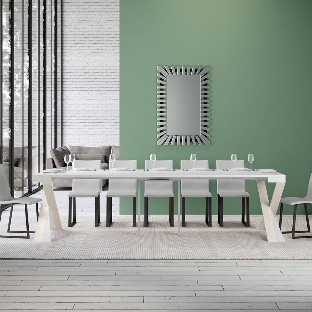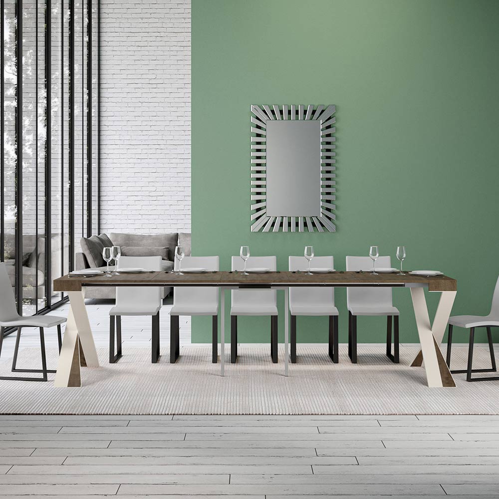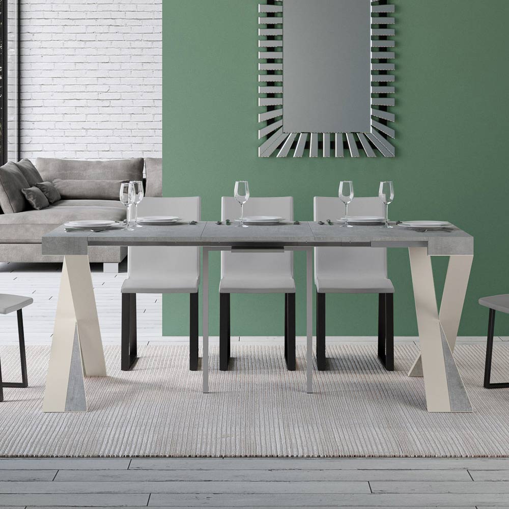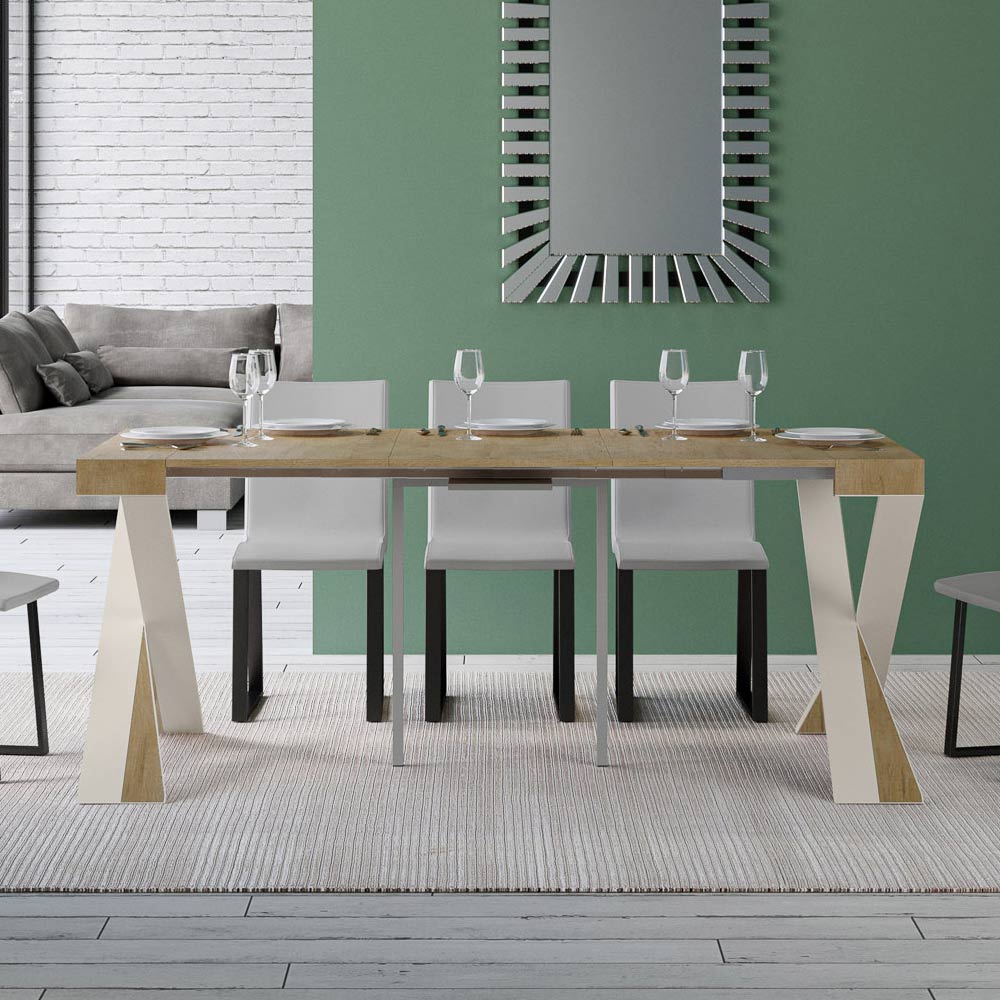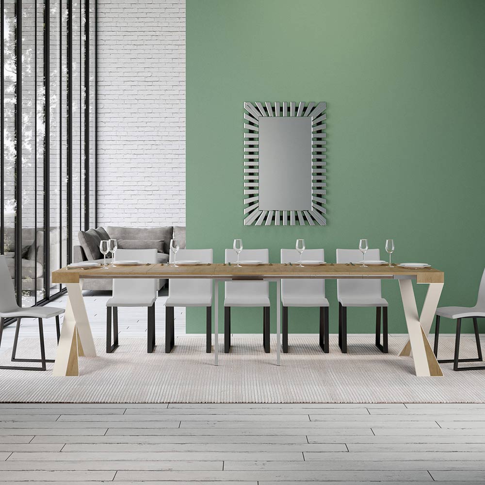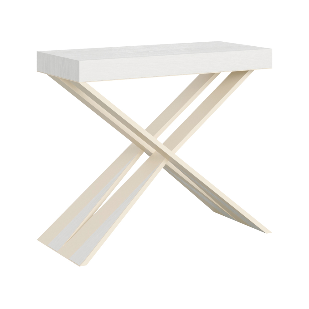Tento rozkládací konzolový stolek ztělesňuje eleganci a funkčnost v poutavém designu. É se vyznačuje moderní siluetou s X podnoží, která nejen poskytuje pevnou oporu, ale také dodává nádech sofistikované originality. Horní deska z čalouněného dřevaè hold kvalitě vyrobeno v Itálii, ceněné pro svou odolnost a schopnost odolávat běhu času.