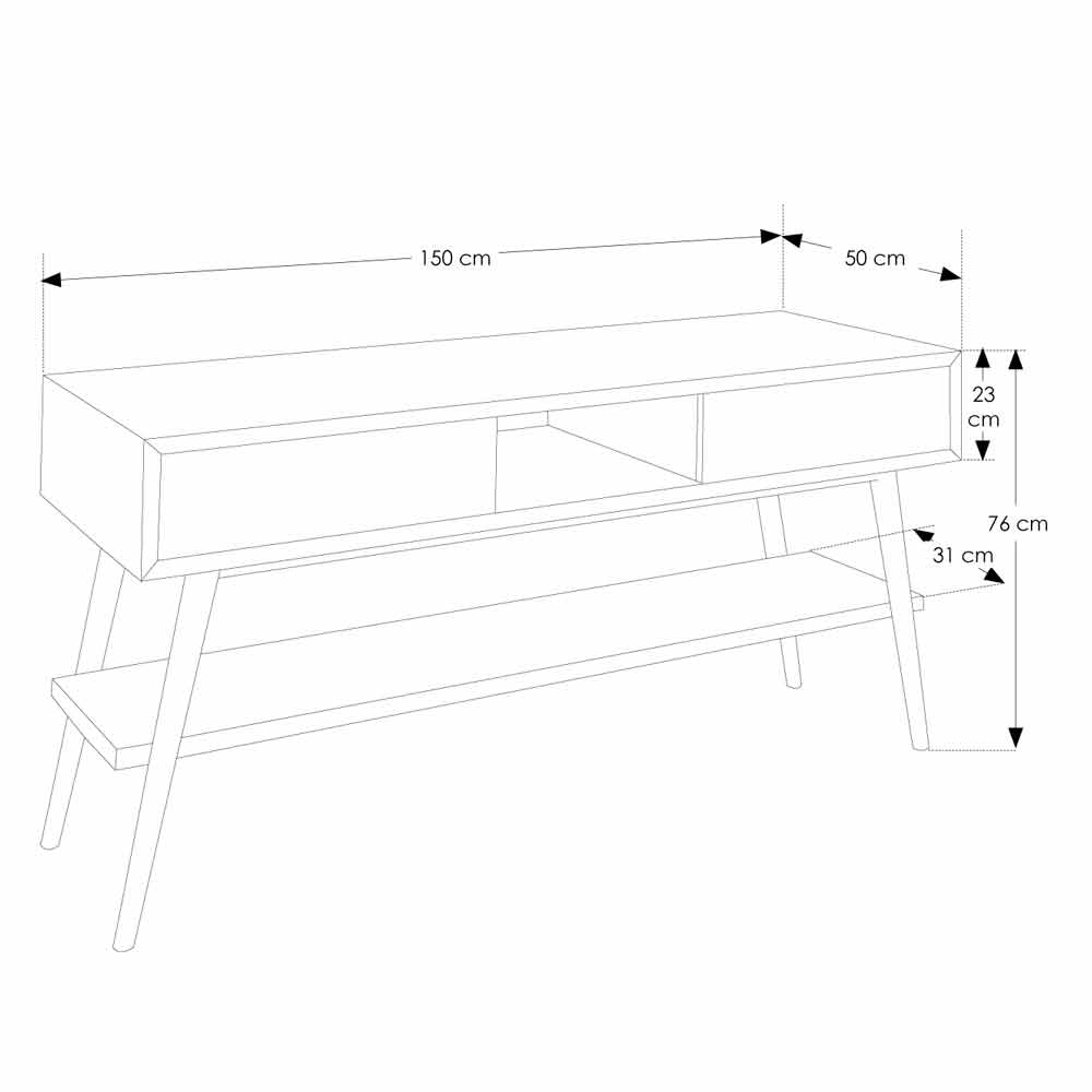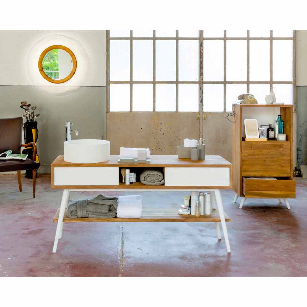 Vyrobeno z ručně voskovaného přírodního teaku, s nohami a dvěma zásuvkami z bílého dřeva.