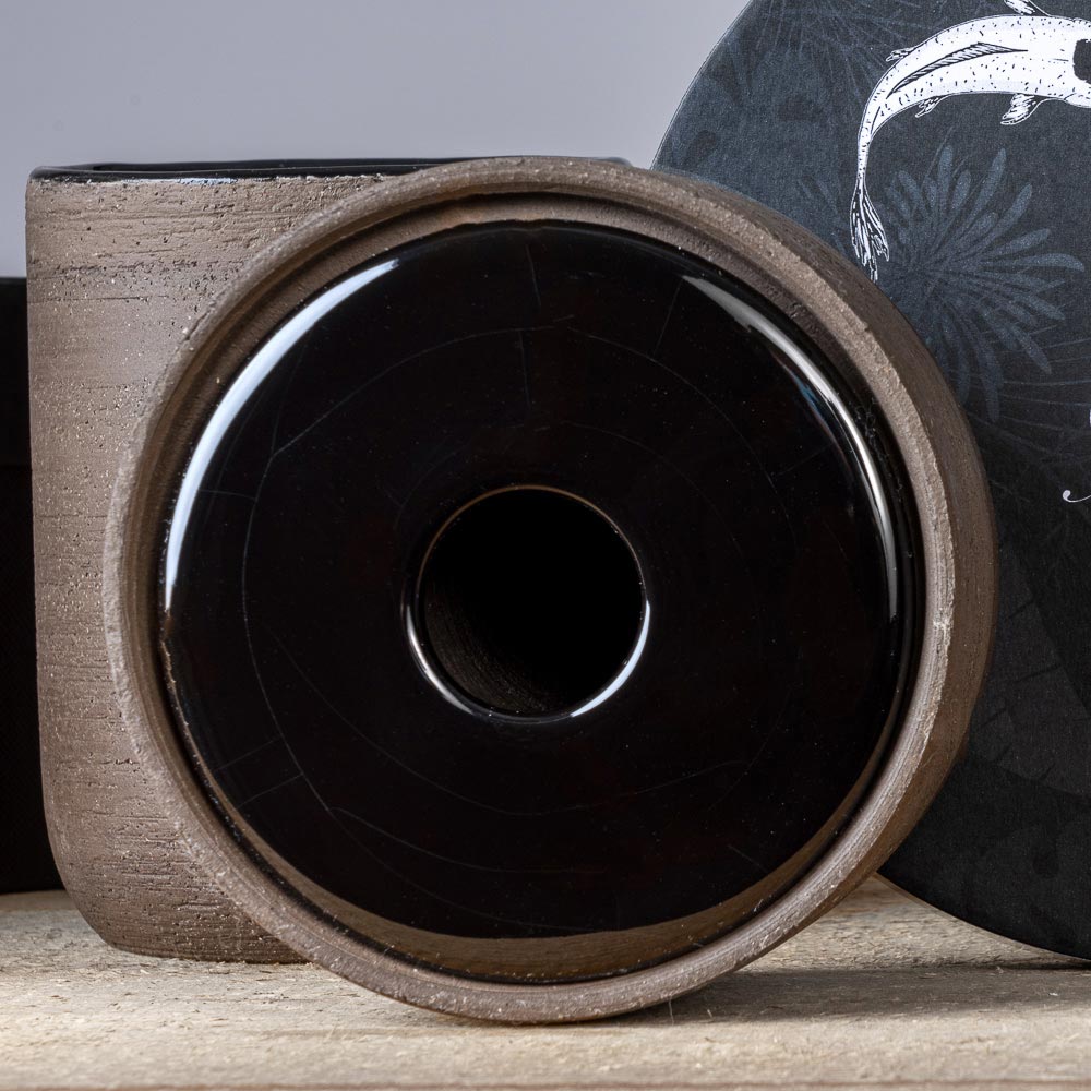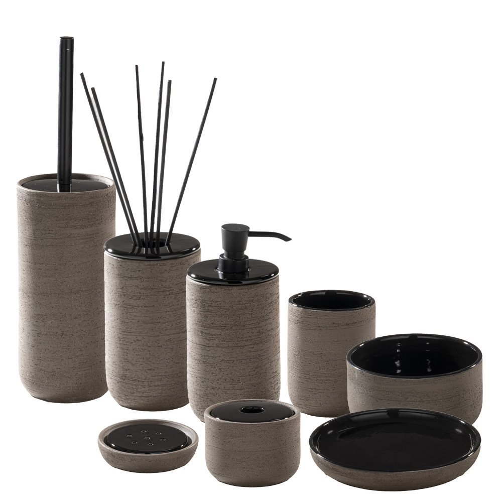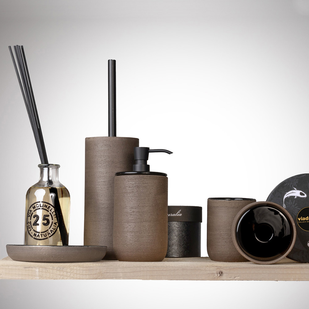 Koupelnové doplňky na desku z hlíny a tmavé zeminy Made in Italy.