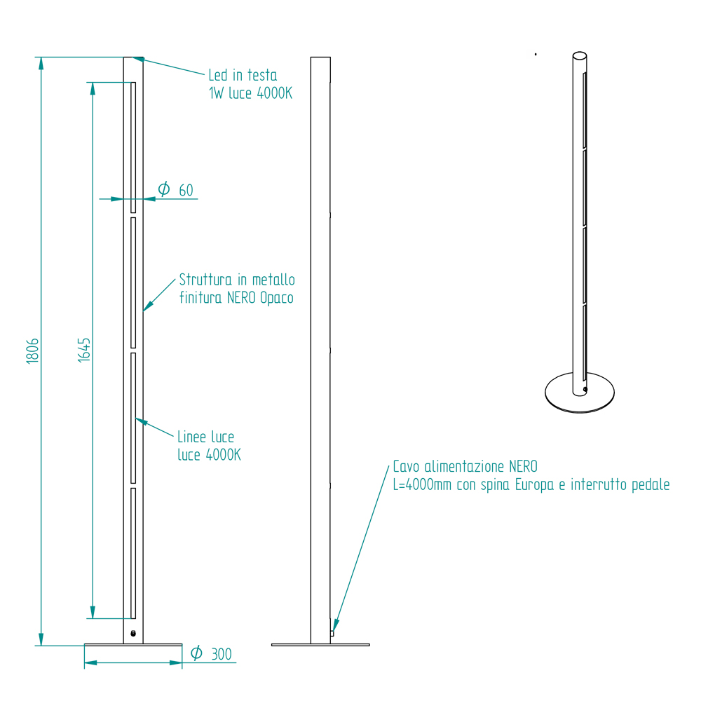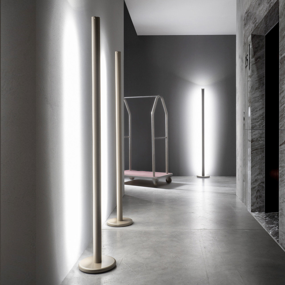 Kovová stojací lampa s dvojitým vertikálním osvětlením, moderní design Made in Italy.