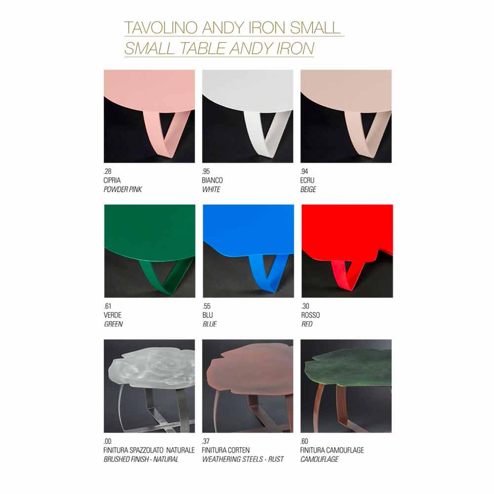 Andy je robustní služba stůl, jednoduché a elegantní, s originálním a moderním designem, vhodný pro všechny typy nábytku. Konferenční stolek z původní formě připomínající květ, jednoduchý, stylizovaný, vyznačující se tím, jednoduché linie, aktuální a mládeže, může přinést nádech kreativity v jakémkoli prostředí, kde je umístěn. Tabulka nenapodobitelná a unikátní konstrukce, jeho základní charakteristikou je uzavřen v použitém materiálu, který je vyroben výhradně z plechu laserem řezané květiny tvaru se základnou i v zakřivené kovu, lakovaného ve stejné barvě jako desku stolu s výjimkou v maskovacím provedení , Epoxydová vrstva s vysokou pevností, je k dispozici v různých odstínech.