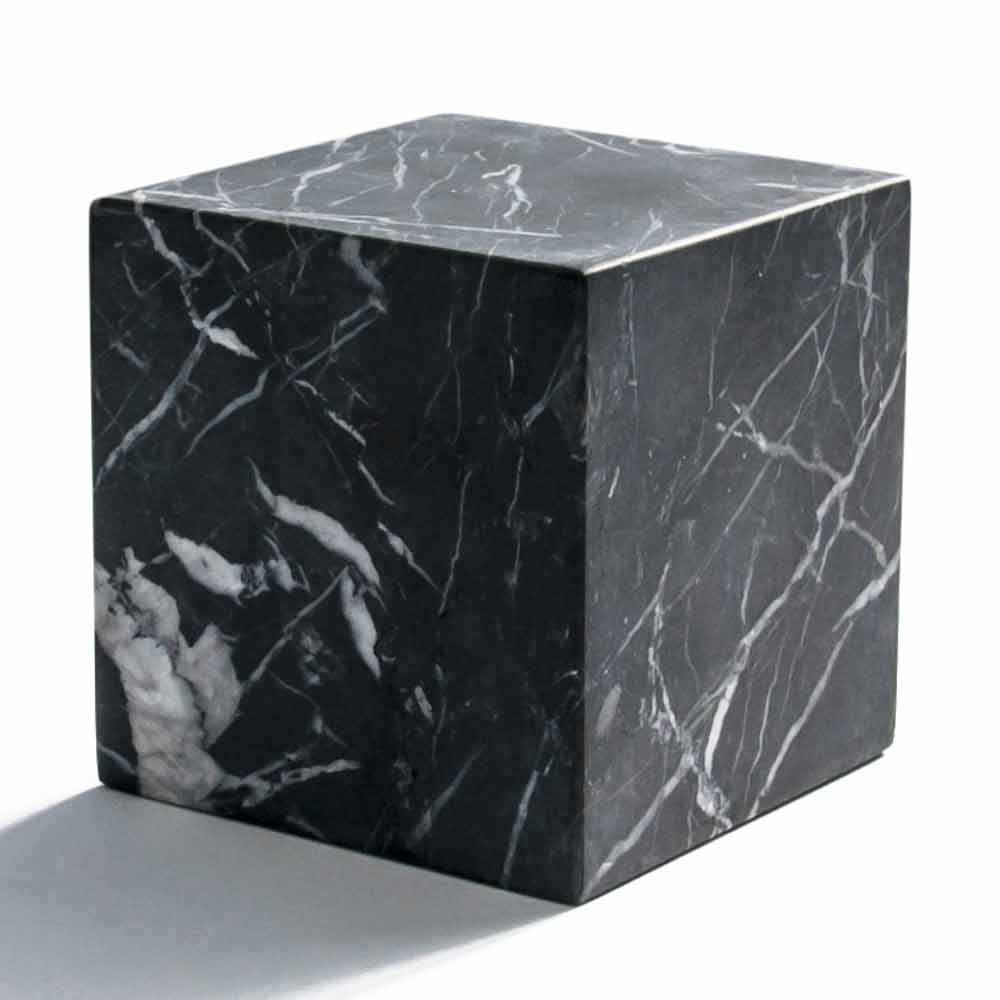 Malé těžítko na kostky vyrobené z černého mramoru Marquinia . Jedná se o jedinečný kus, protože každý použitý blok mramoru se liší od ostatních pro žíly a odstíny.