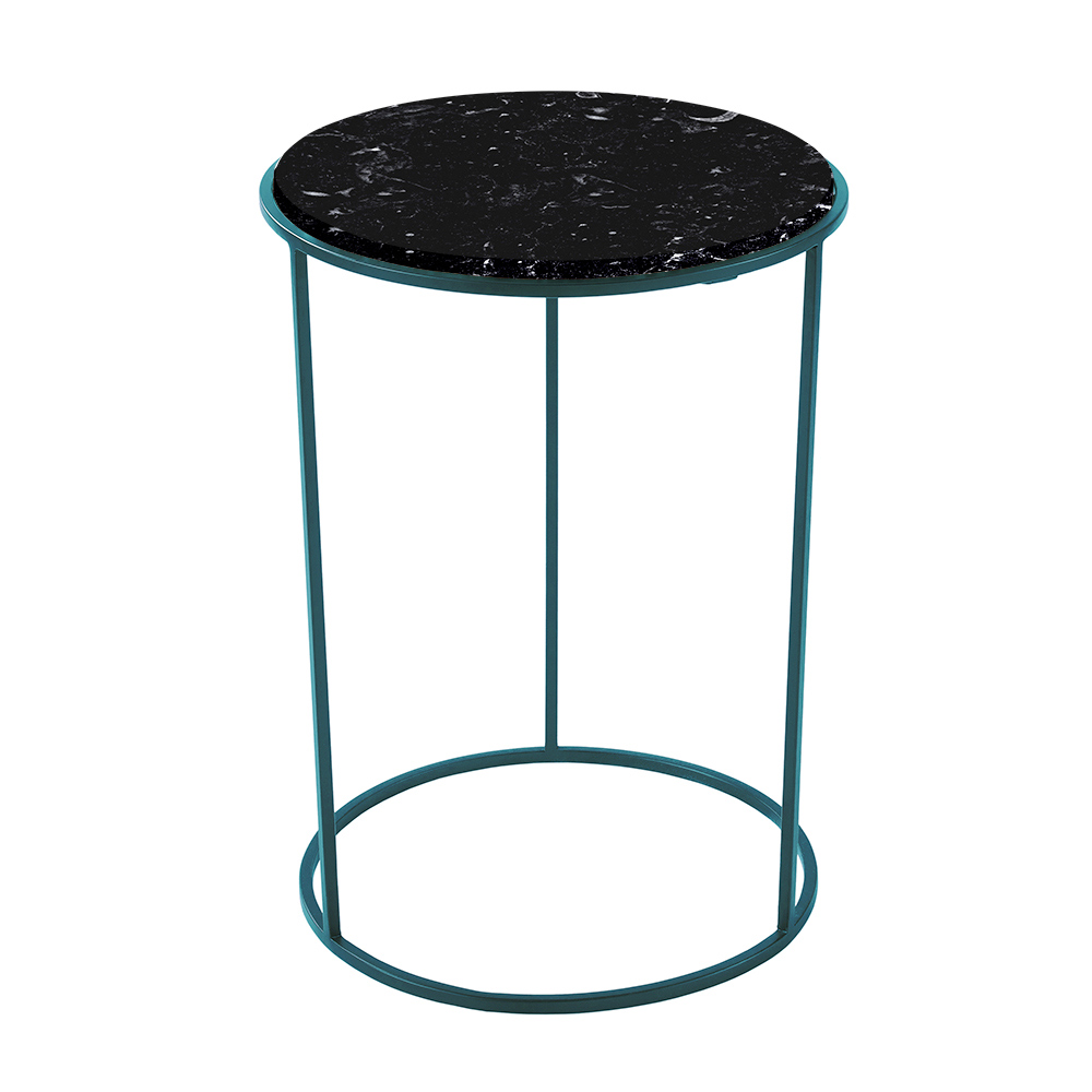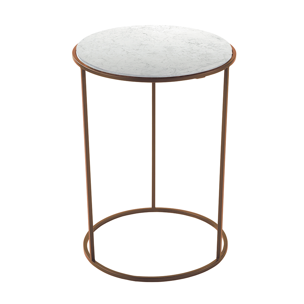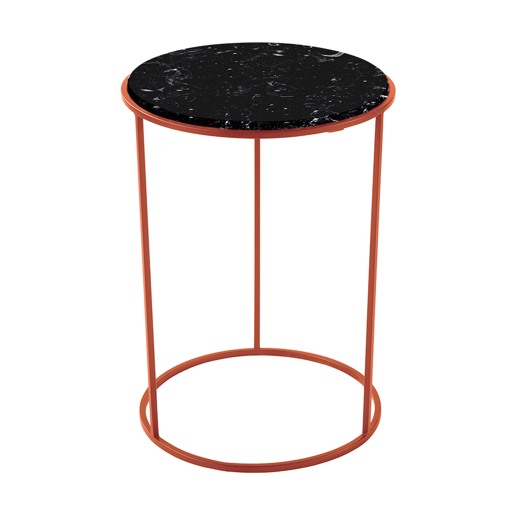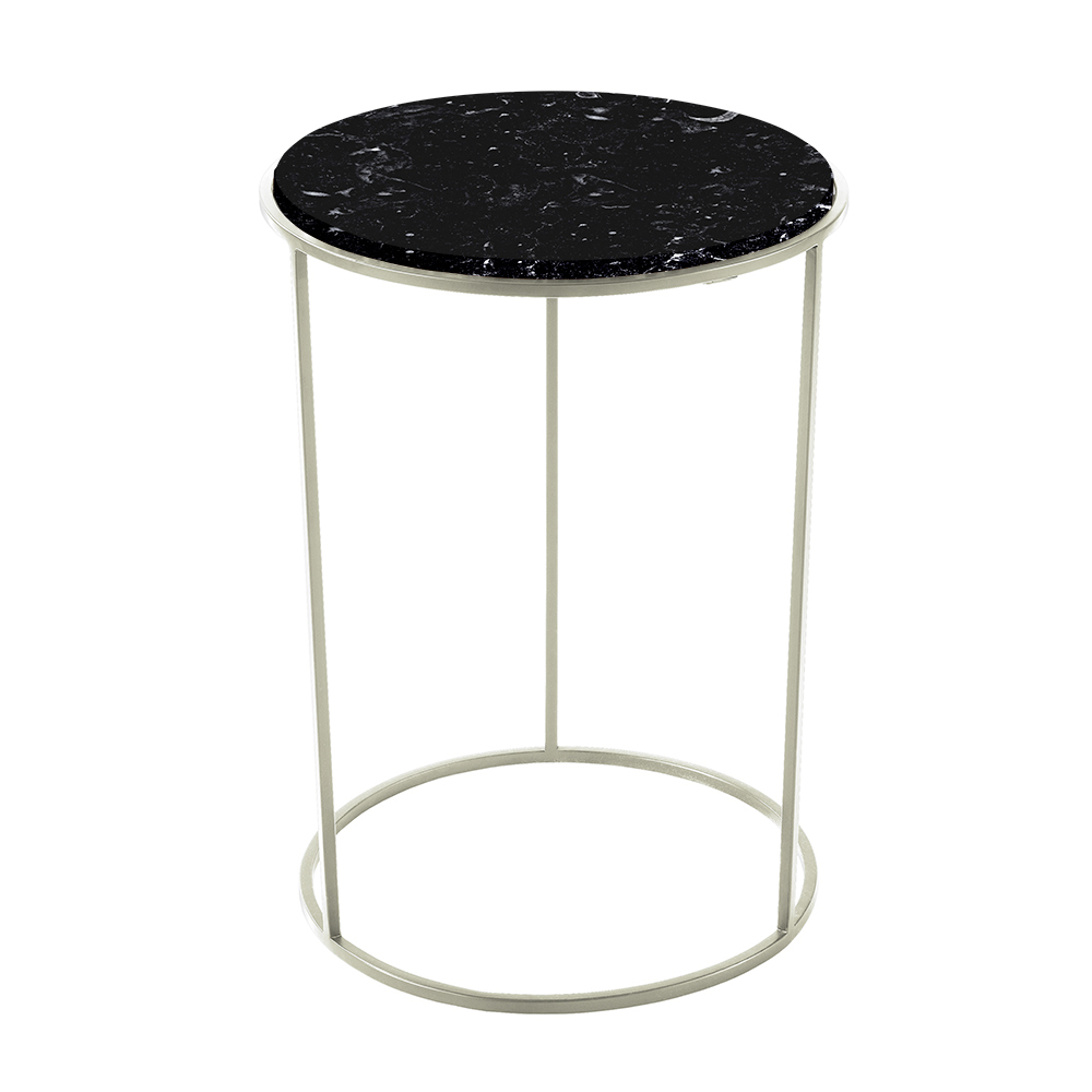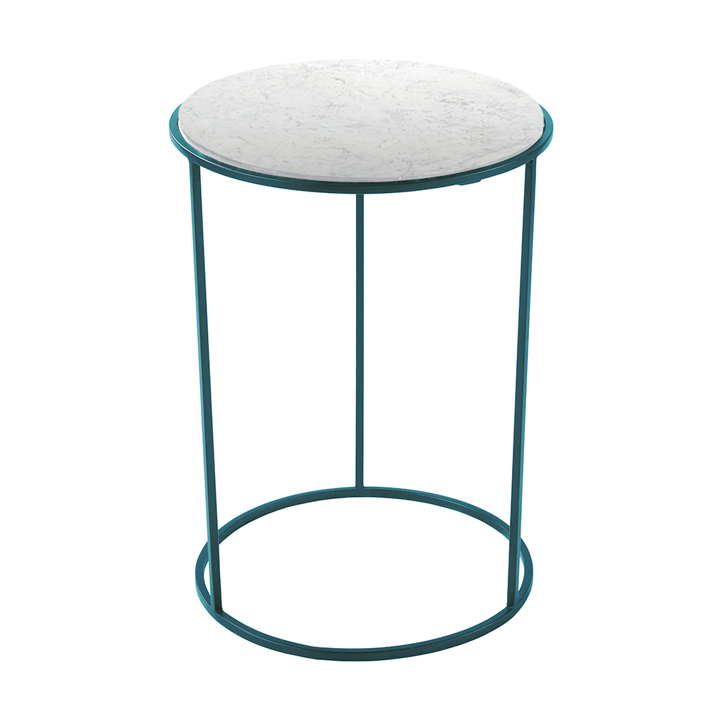 kulatý konferenční stolek s neprůhlednou mramorovou deskou, dostupný ve třech různých variantách, má minimální a zásadní linie.