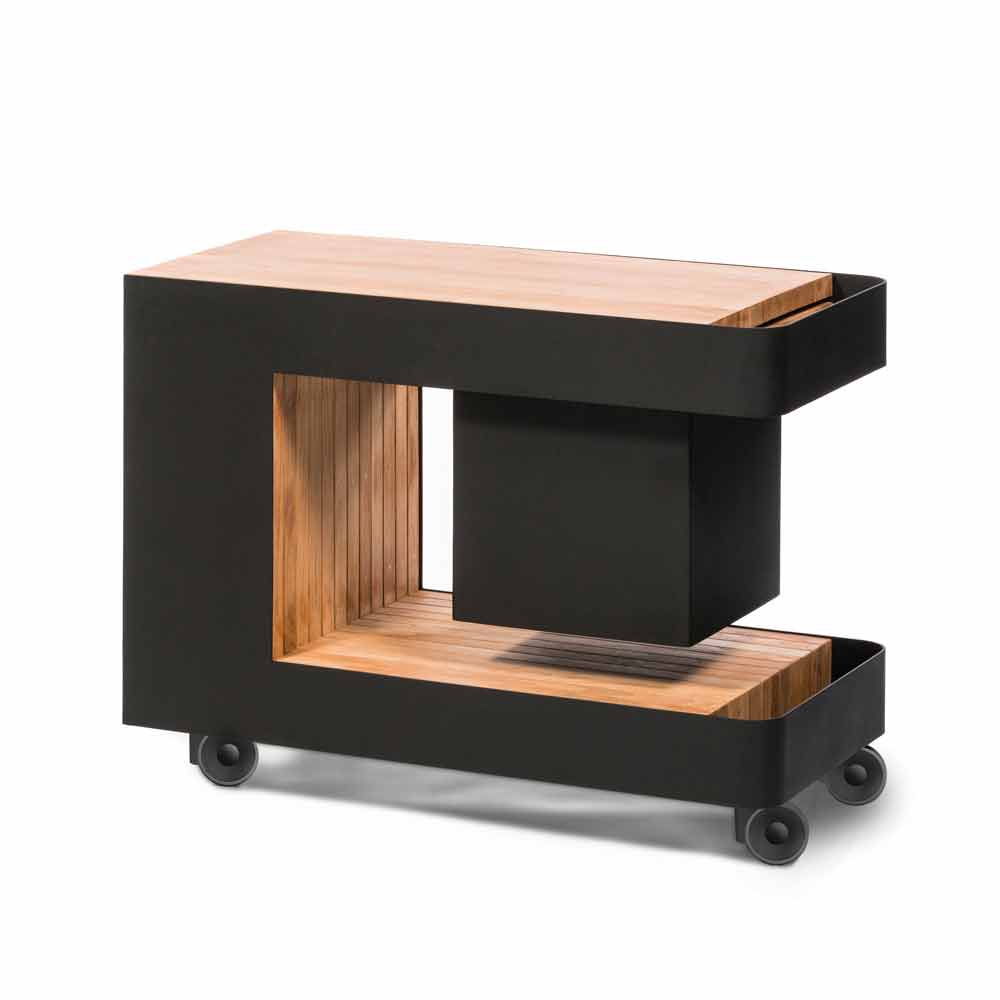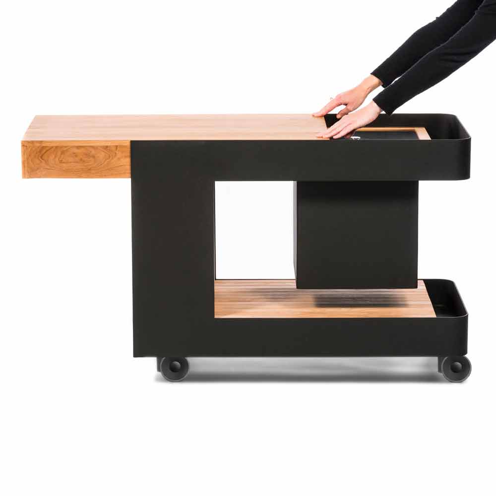 Mobilní tyč na kolečkách pro venkovní použití se stolem, moderní design, dřevo a ocel, vysoká kvalita.