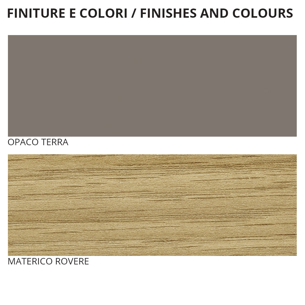 manželskou postel s rámem postele a čelem z matně lakovaného dřeva s povrchovou úpravou země, 2 noční stolky, z nichž jeden je modulární (skládá se ze 2 prvků), komodu se 4 zásuvkami a vysokou komodu s 5 zásuvek (složených z 5 modulárních prvků) z matného lakovaného dřeva s povrchovou úpravou terra a strukturovaným dubem. Kompozice pro spací prostor vyplývající z pečlivé studie velikostí a objemů, která dává život prvkům schopným odlišit se svou