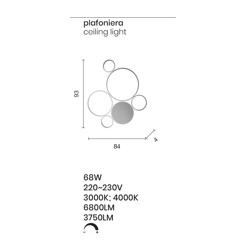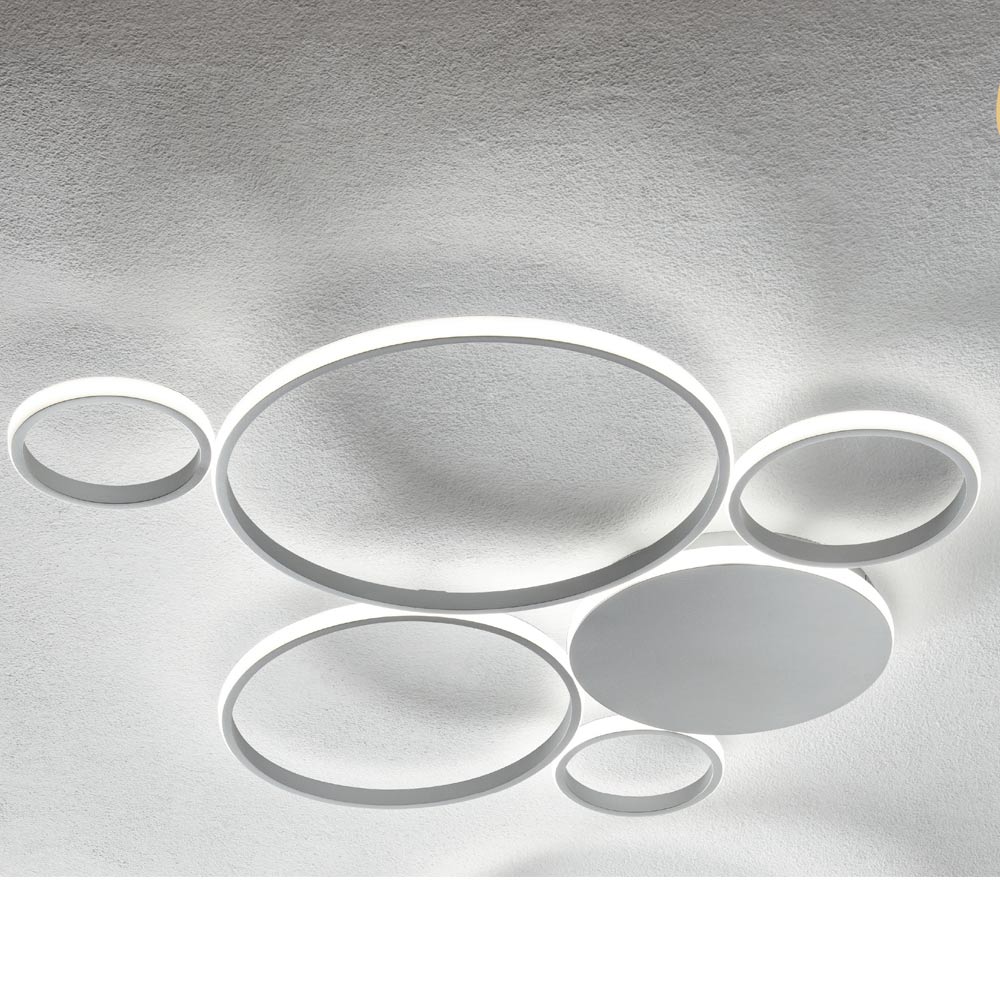 LED zdrojem. Originální kompozice složená z kruhů různých velikostí spojených dohromady a pokrytých zvenčí mléčně bílým difuzorem, který obepíná led pás, vytváří nádherné světelné efekty na stěnách ve výsledku se