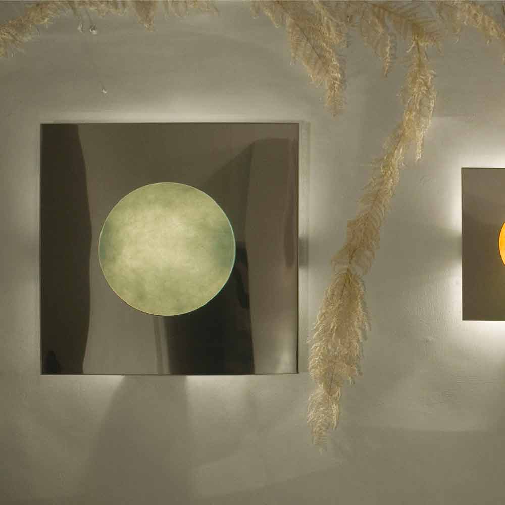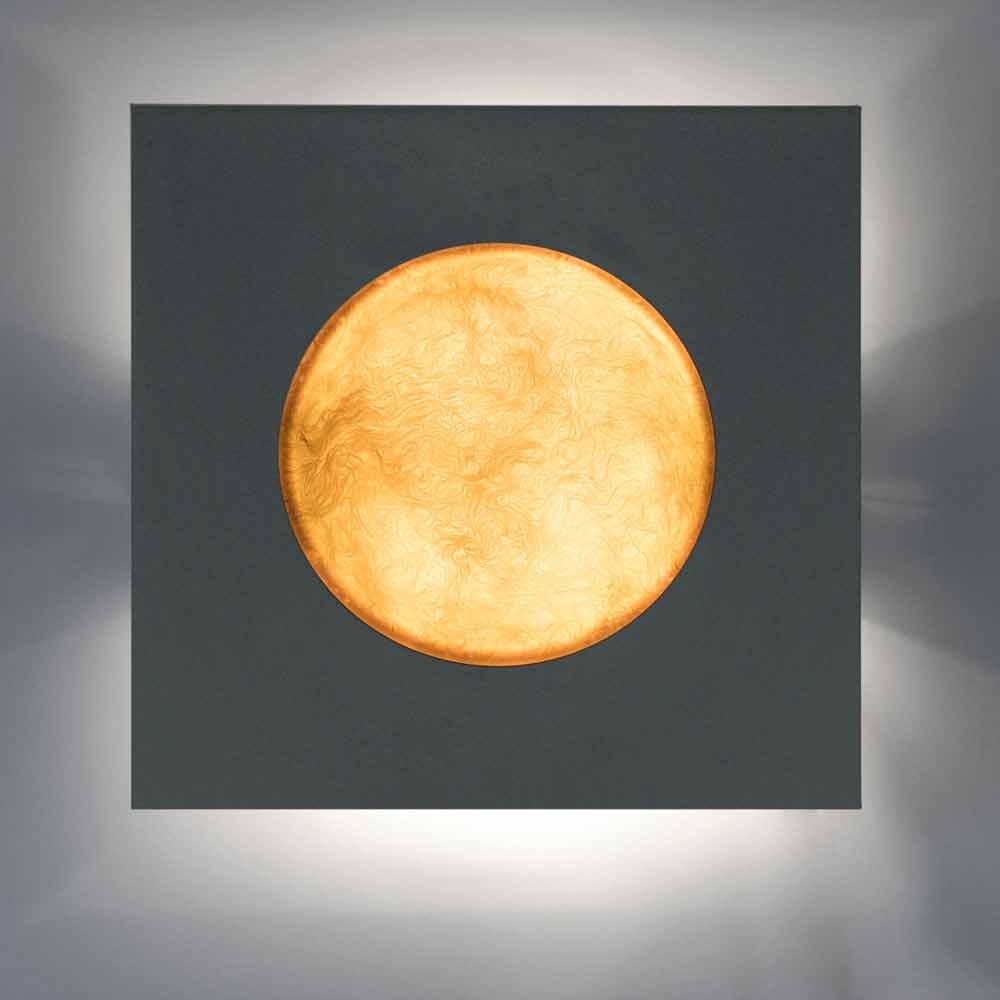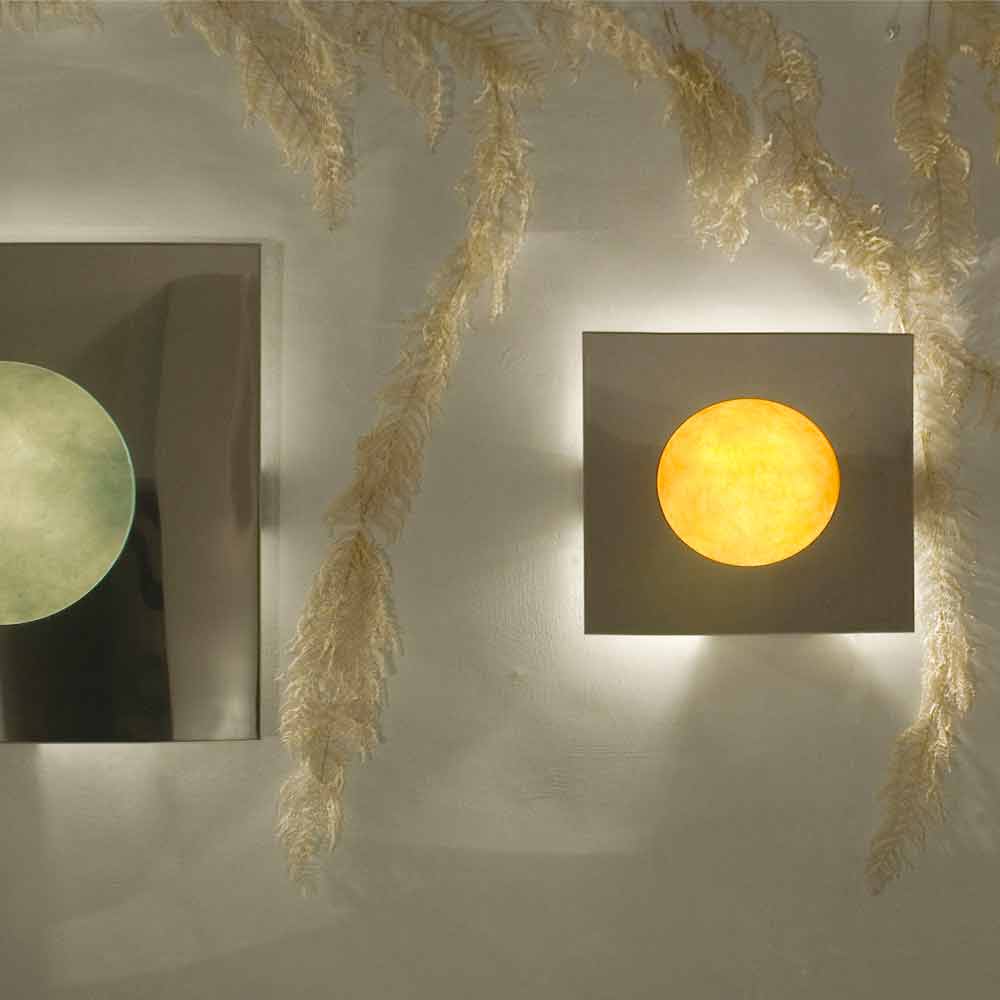 Skvělé umělecké dílo vyrobené z leštěné oceli a Nebulitu, materiál složený z pryskyřice a vlákniny, jejichž žíly dávají žárovce zvláštní měsíční účinek.