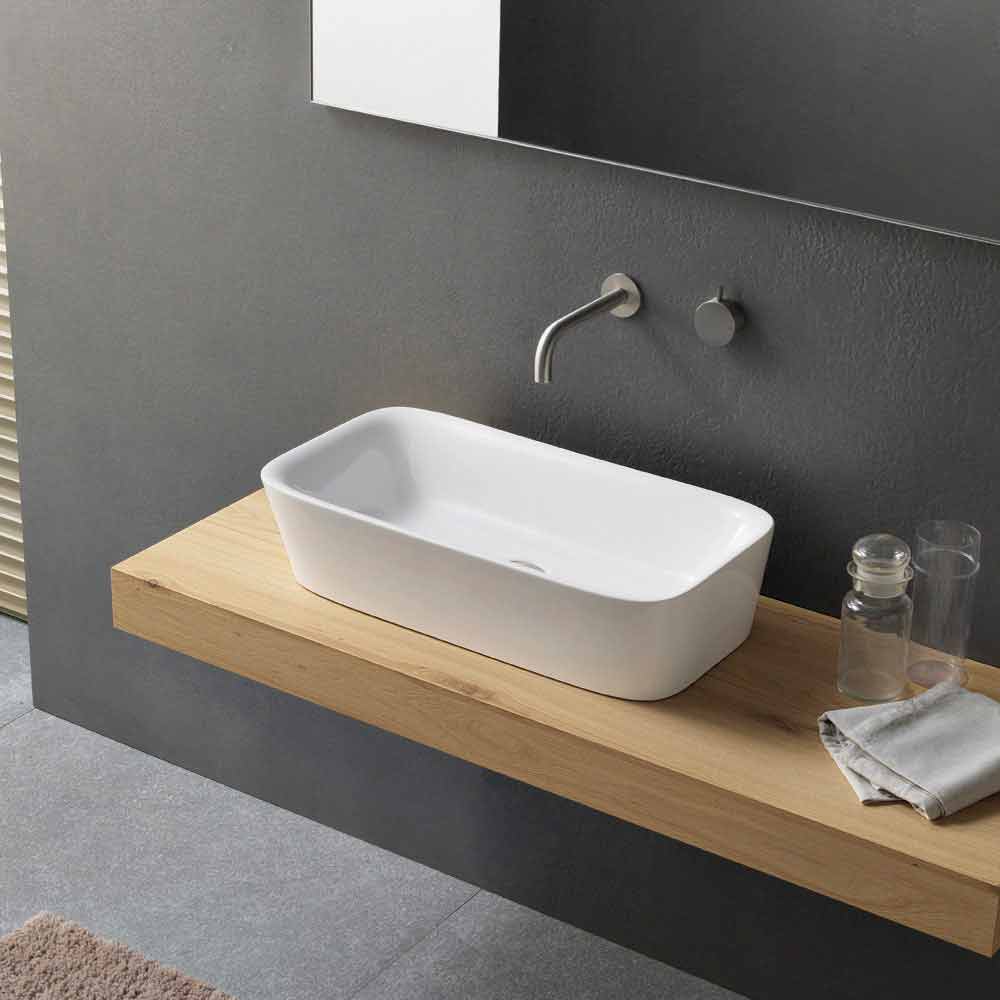 Umyvadlo na desku v bílé keramice, moderní obdélníkový design s vysokými a zaoblenými hranami, vyrobené v Itálii.