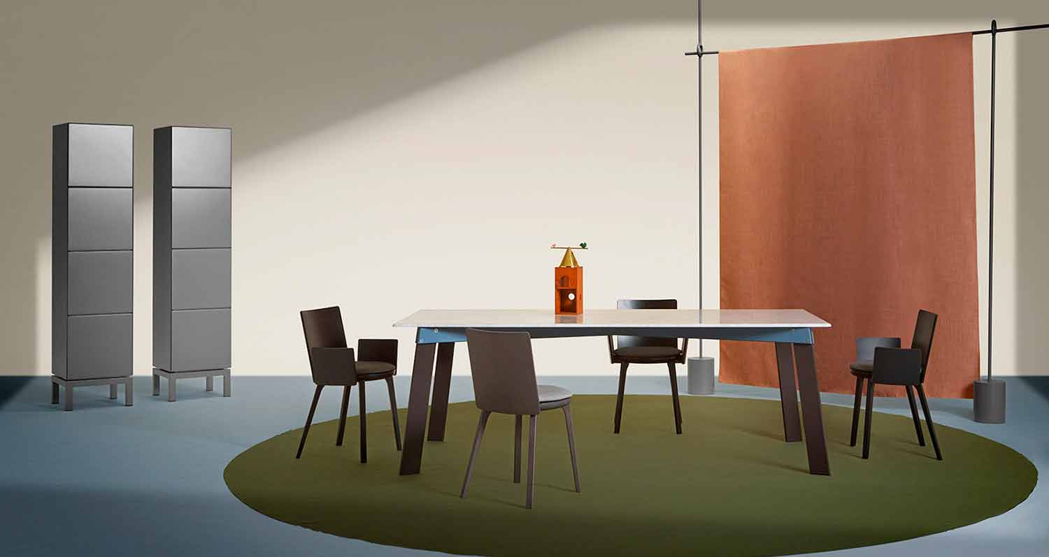 Originální a funkční , vidlicový design ocelových konců umožňuje vložení nohou, také z oceli, s jednoduchým systémem montáže. Technický a praktický detail, který se stává také estetickým: spojovací šrouby a výběr odpovídajících nebo kontrastních barev jej zvýrazňují a vytvářejí