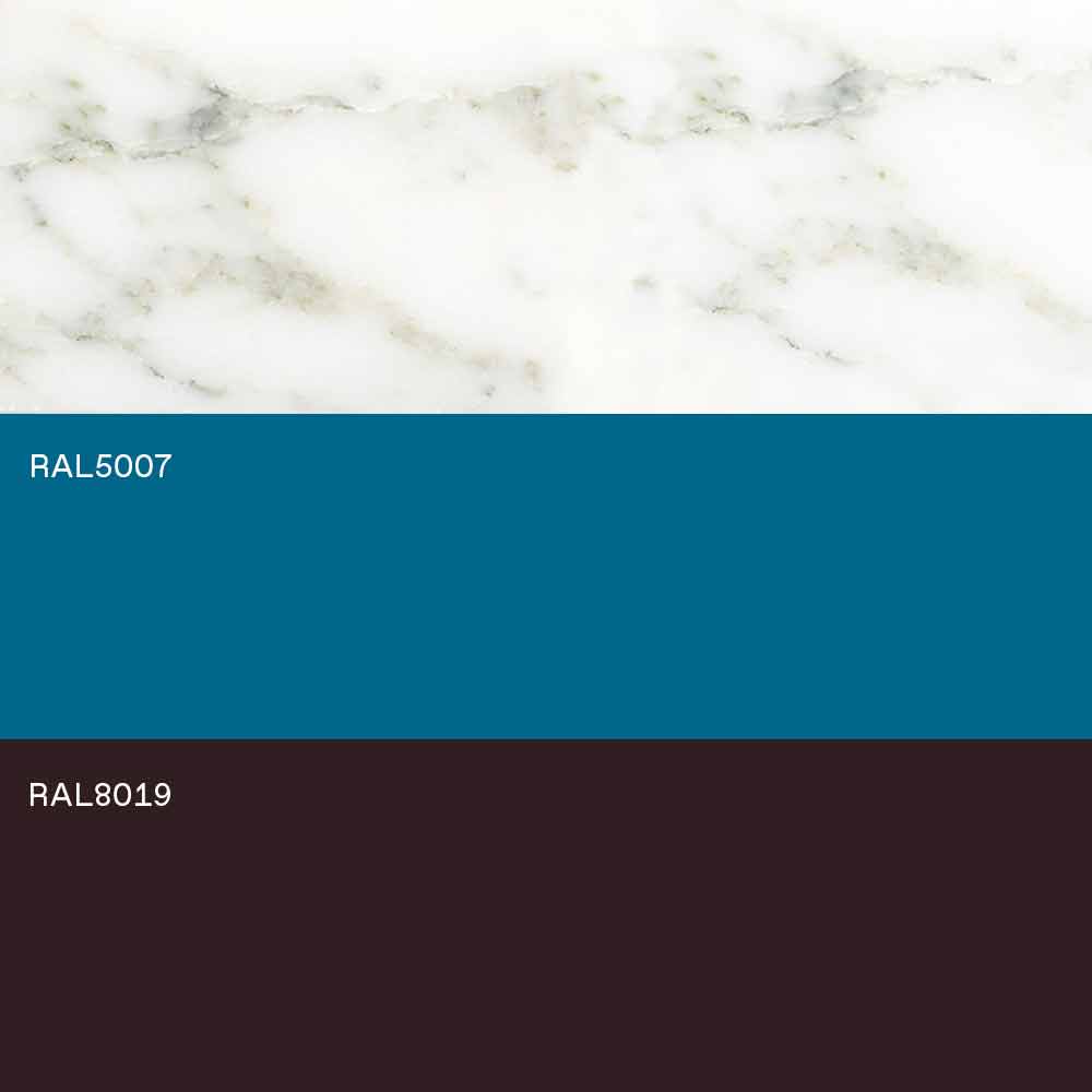 Povrchová úprava : káva RAL8019 + kříž ve světle modré RAL5007 + deska z bílého mramoru Michelangelo