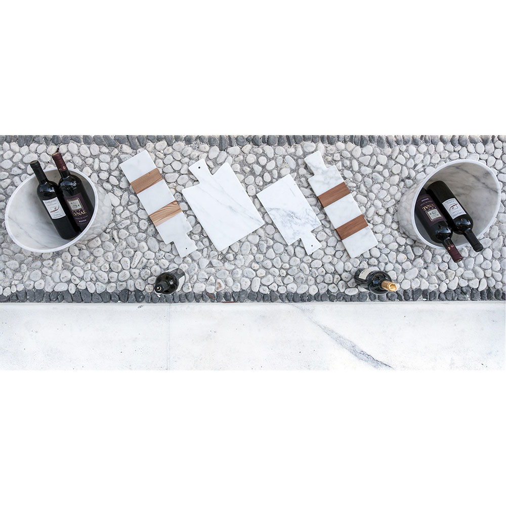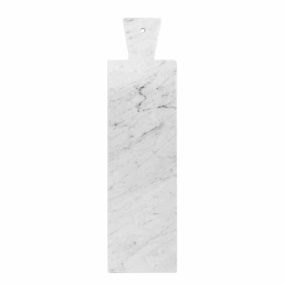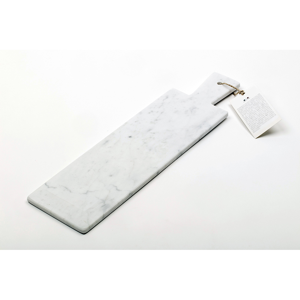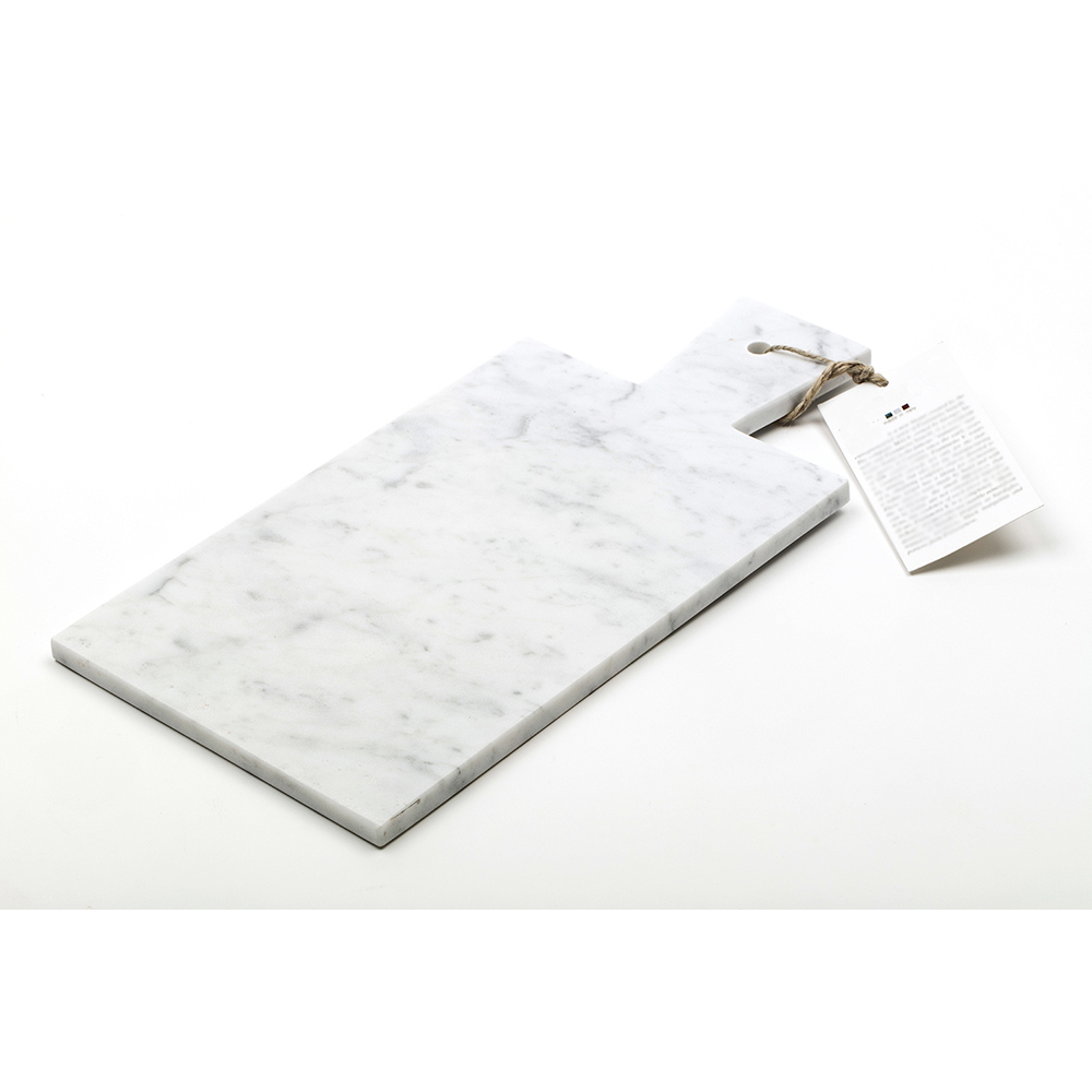 Moderní obdélníkové prkénko který se vyznačuje bílým mramorem Carrara vysoká kvalita použitá k jeho výrobě. Obsahuje praktický otvor na rukojeti, který lze použít k zavěšení. Je třeba jej považovat za jedinečný kus, protože každý blok mramoru je odlišný v žilách a odstínech.