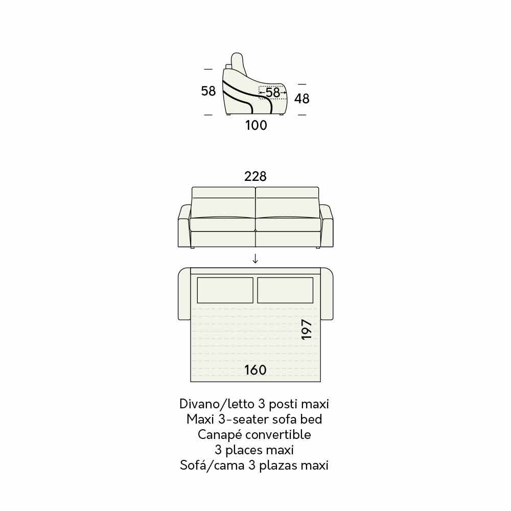 - L 228 x P 100 x H 104 cm (matrace: L 160 x P 197 x H 14 cm).